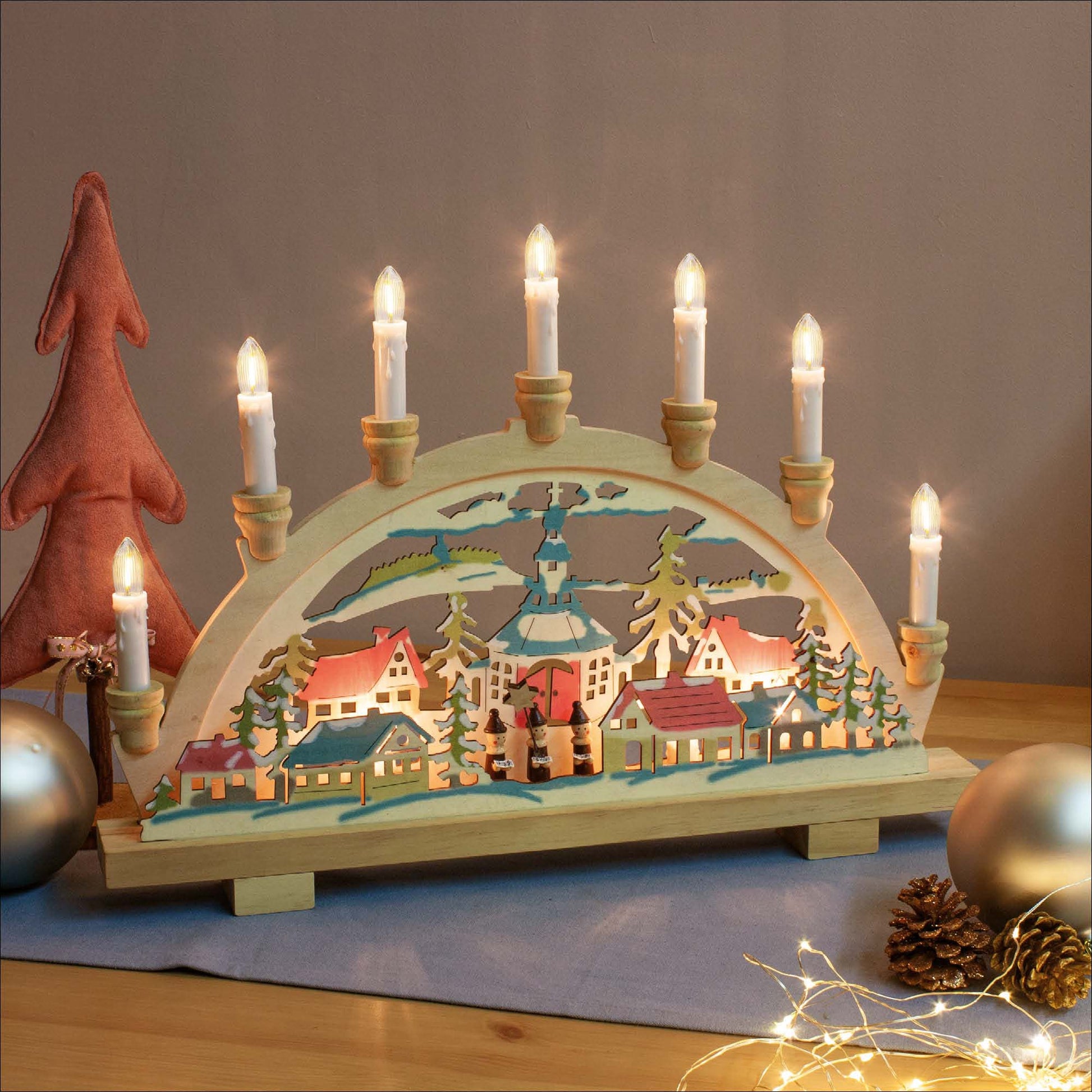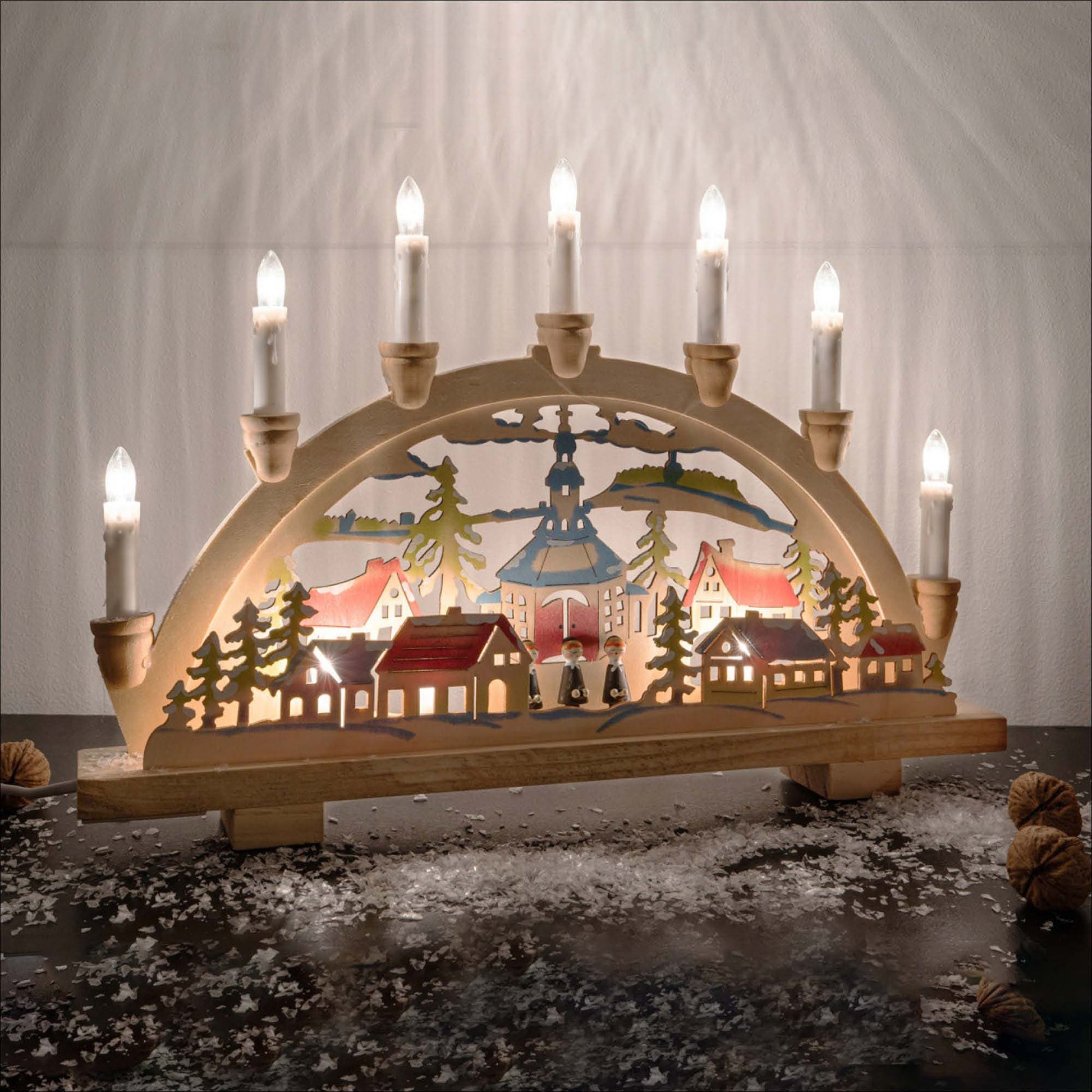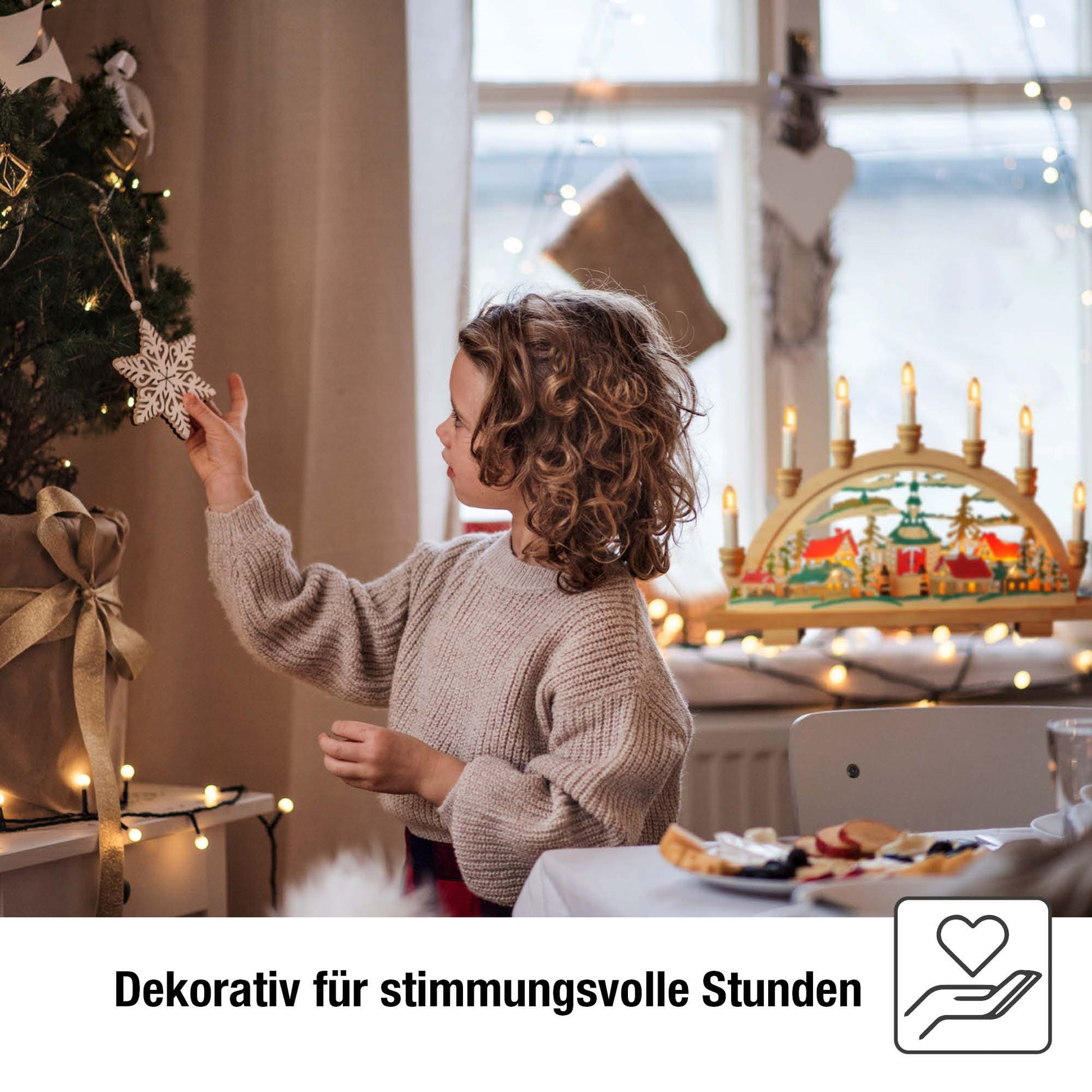 Der wunderschöne weihnachtliche Holzleuchter zeichnet sich aus durch sein klassisches Design kombiniert mit feinen Zierelementen. Seine 10 Riffelkerzen verströmen ein angenehmes Licht, das sogleich Wohlfühlatmosphäre hervorruft. Gönnen Sie sich stimmungsvolle Stunden!