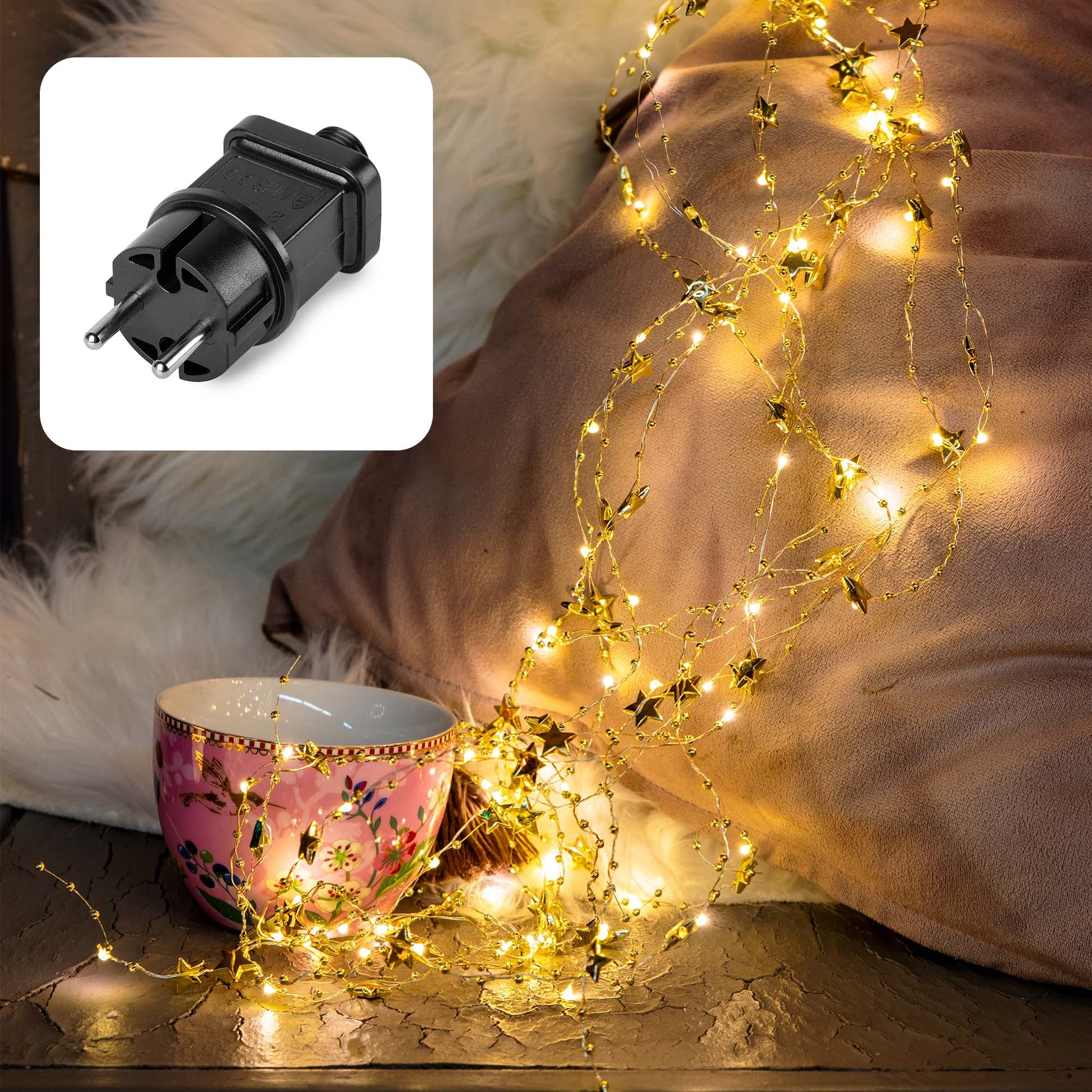 120-tlg. LED-Sternen-Girlande, warm-weiß, goldene Sterne, kupferfarbenes Kabel, Timer, Innen-Trafo