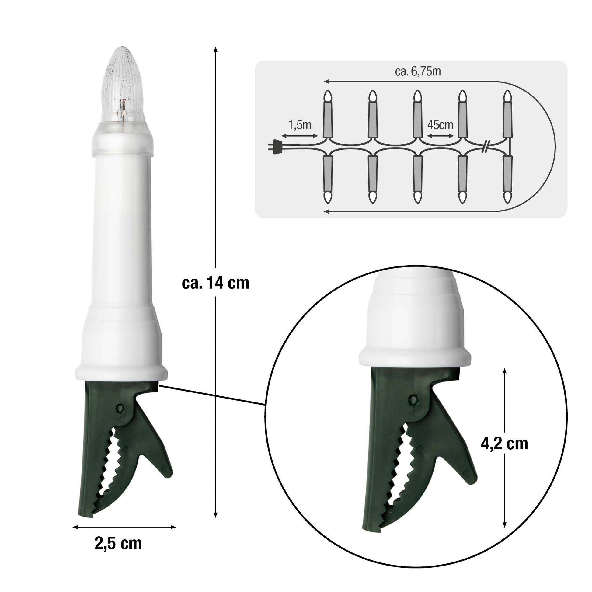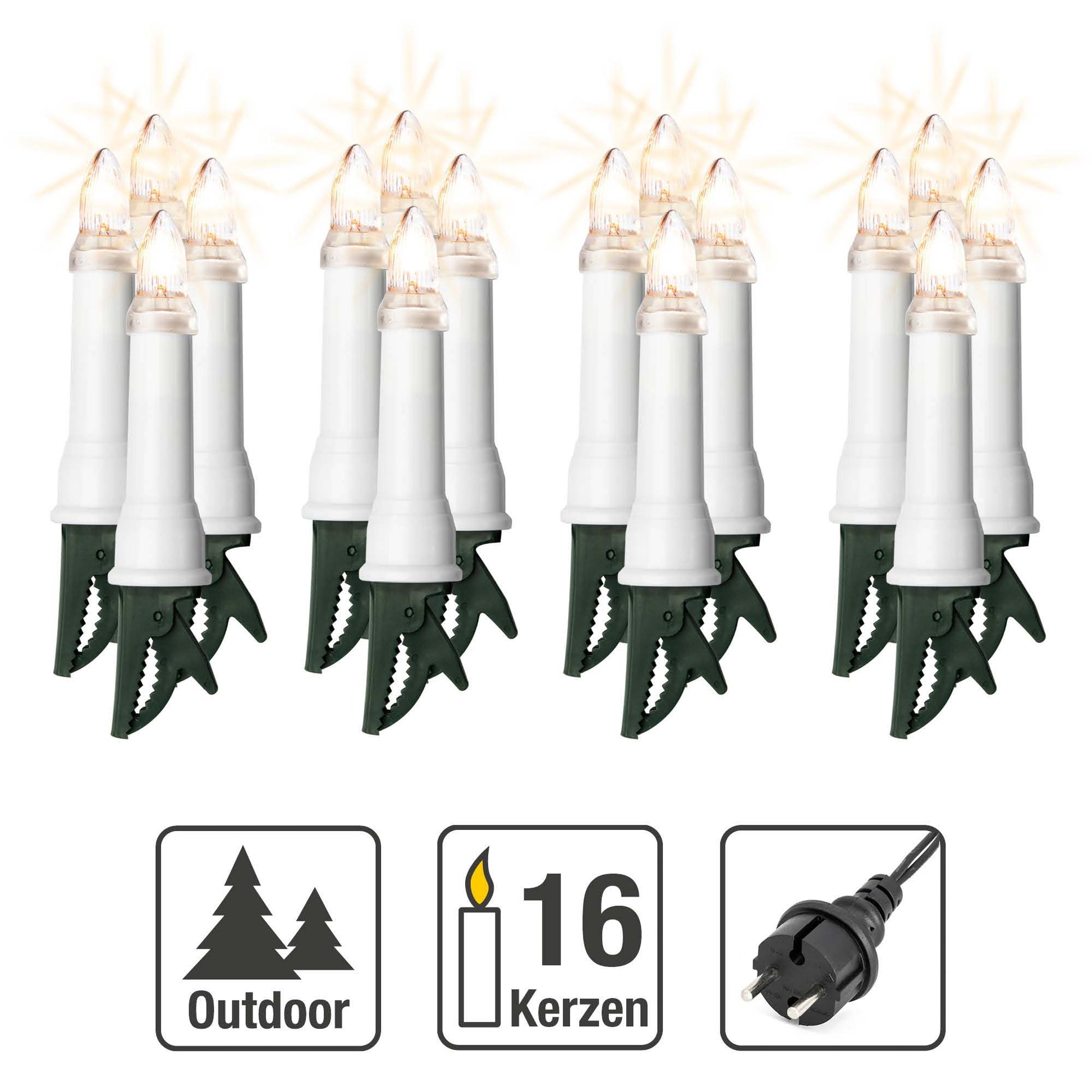 16-tlg. Riffelkerzenkette klare Lampen, für außen, mit EU-Stecker