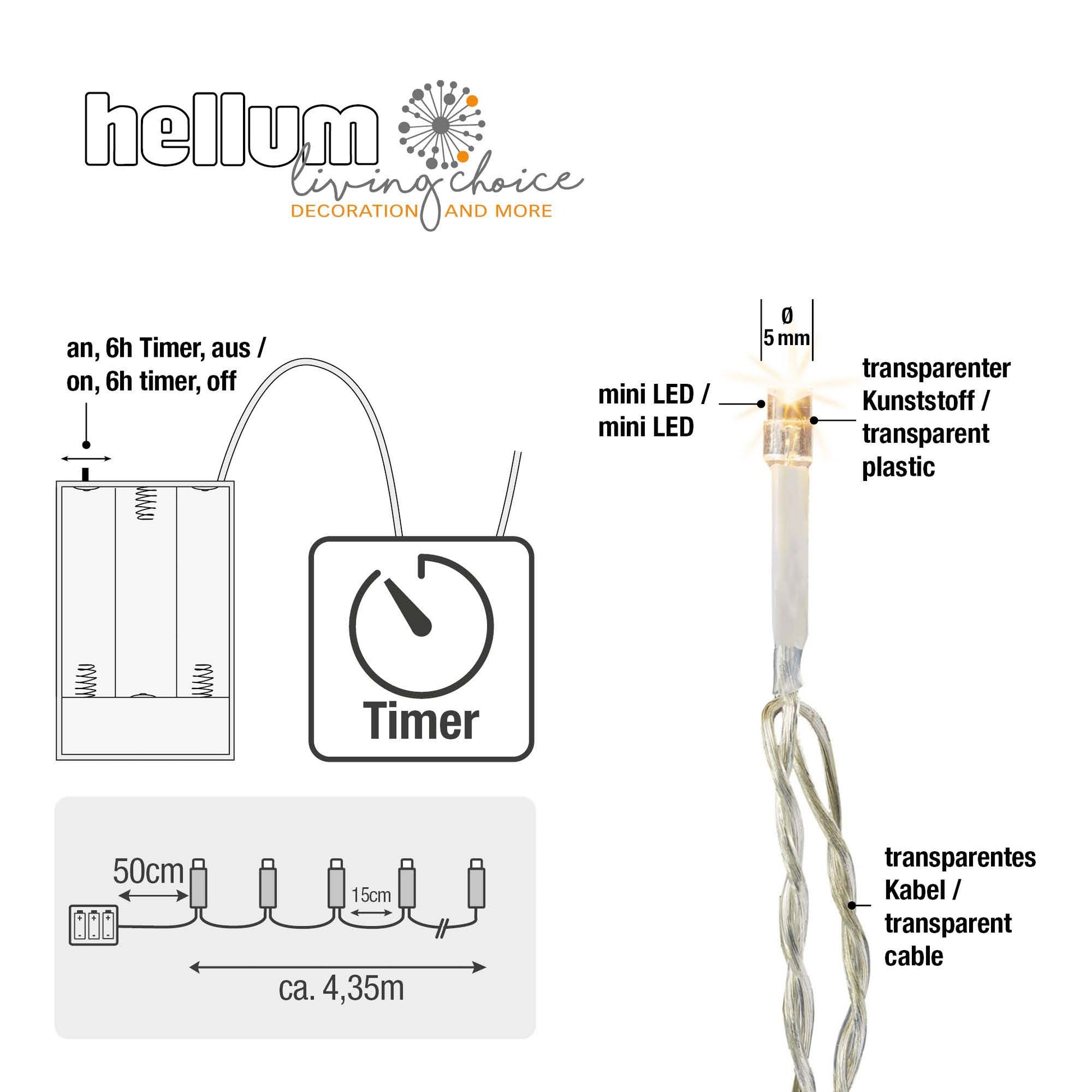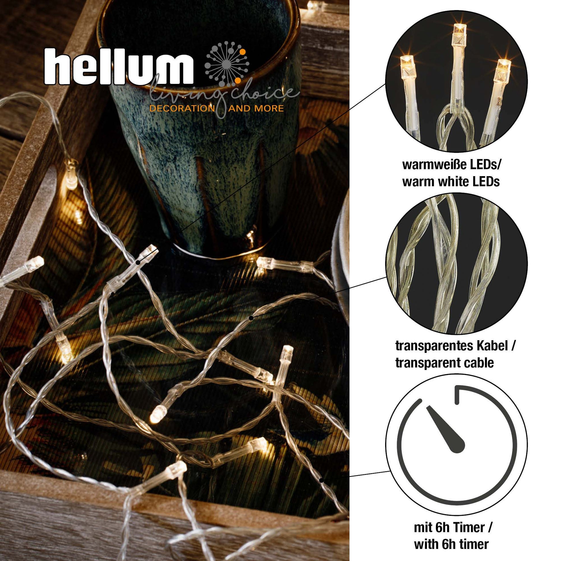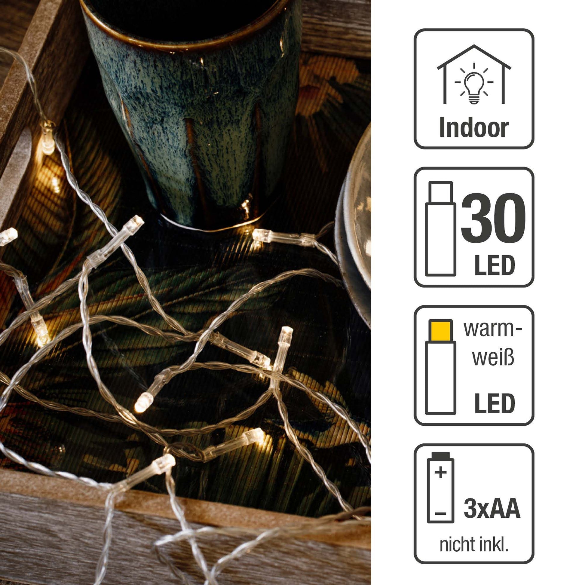LED-Lichterkette, 30 LEDs ww, transparentes Kabel, batteriebetrieben