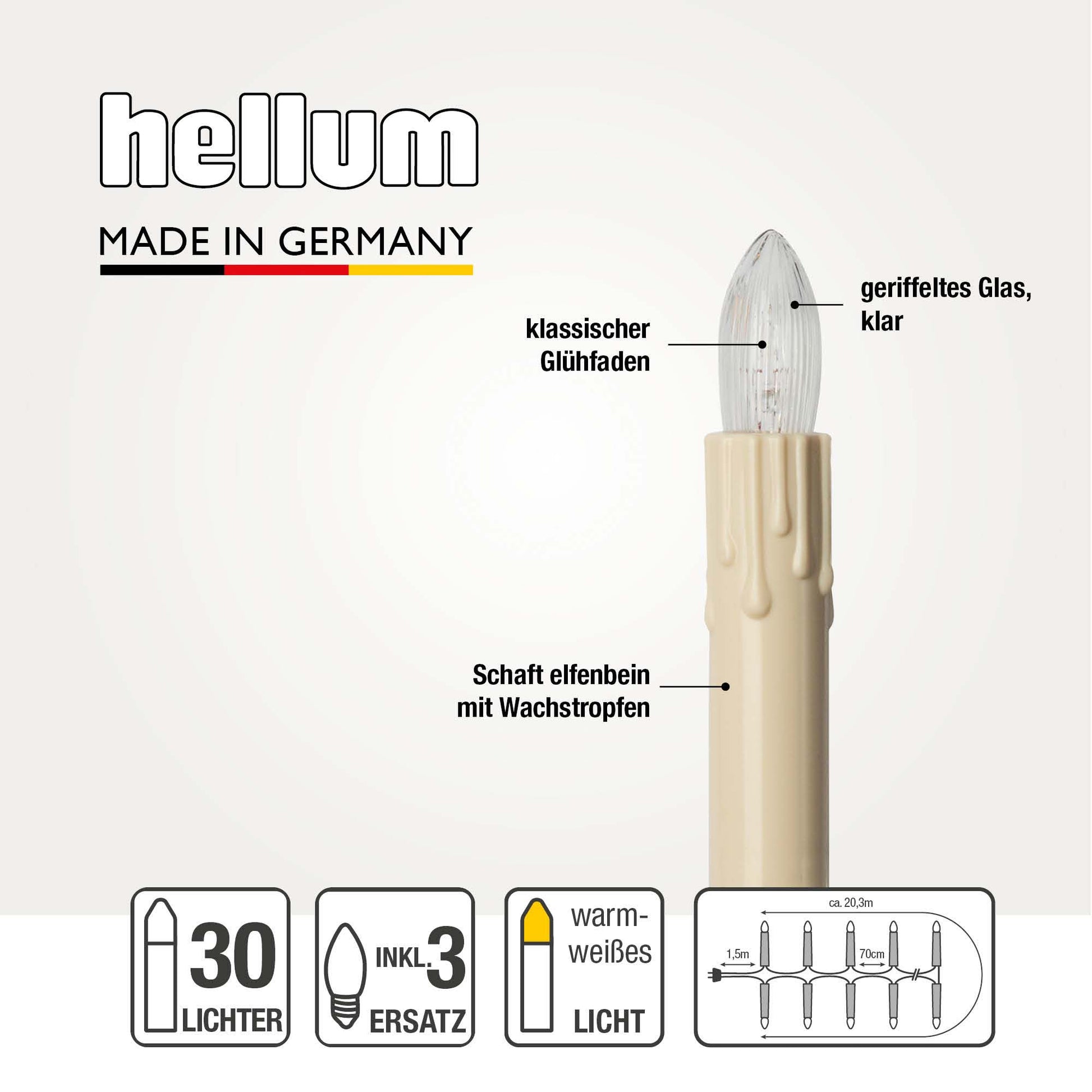 Lichterkette Weihnachtsbaum innen 30 teilig, Made in Germany, Riffelkerzen, mit Wachstropfen, inkl. 3 Ersatzkerzen, elfenbein, Glühfaden