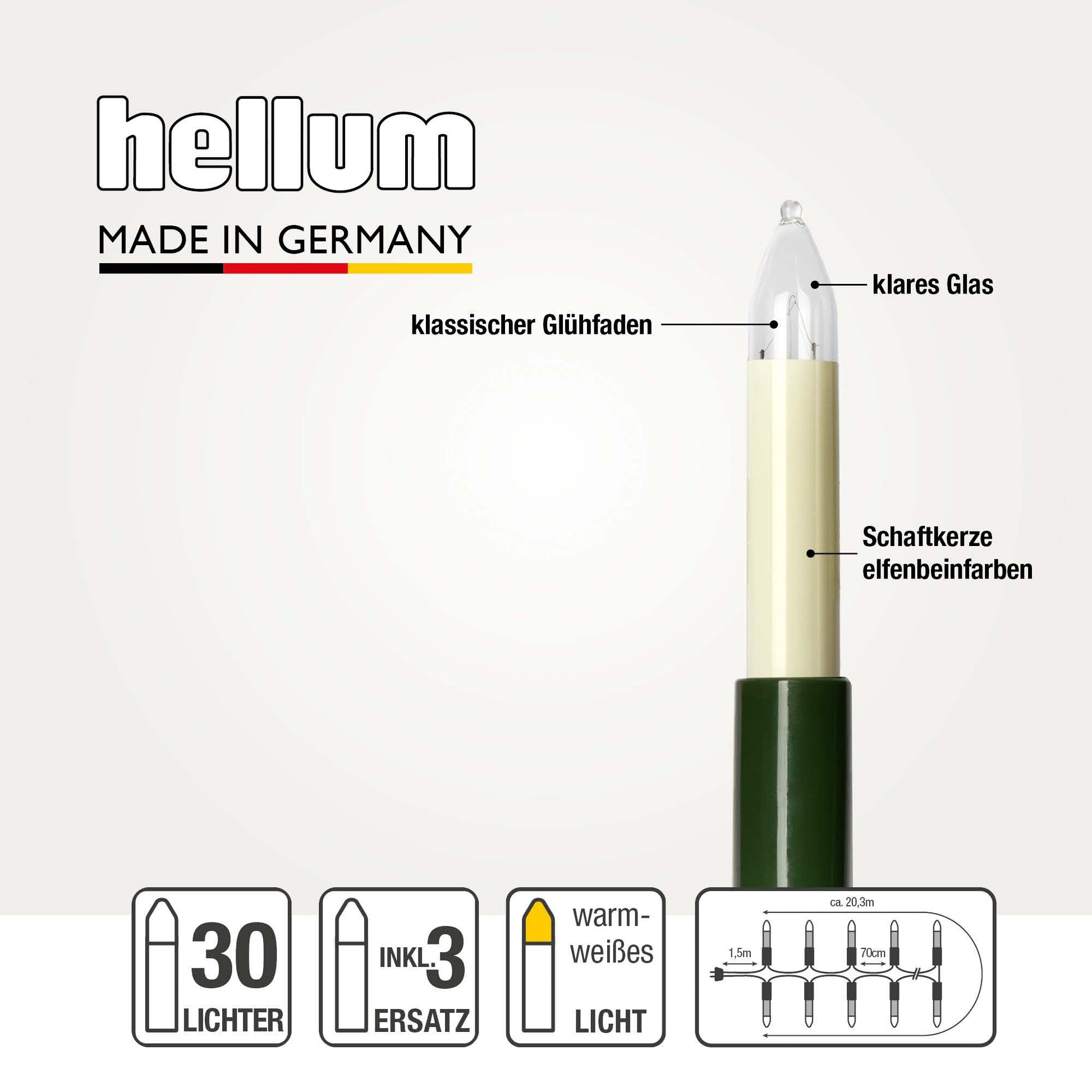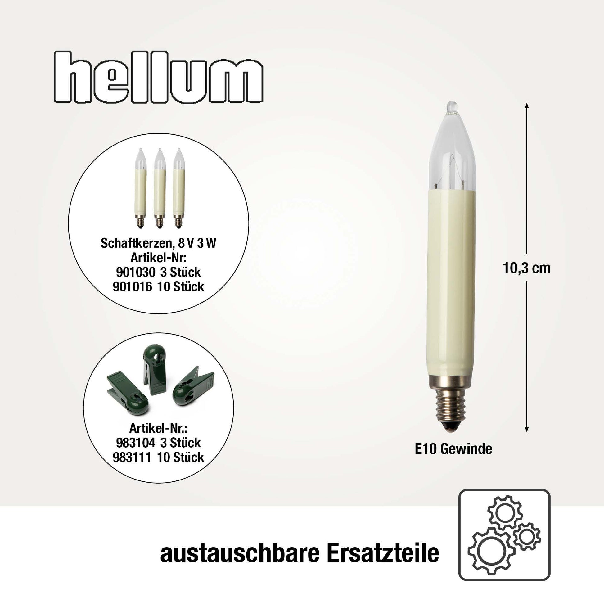 Austauschbare Ersatzteile – Passende Ersatzkerzen und Clips sind verfügbar und sorgen dafür, dass Sie Ihre Lichterkette innen mit Stecker über viele Jahre hinweg nutzen können. Für diese Christbaumbeleuchtung innen passen die Ersatzbirnen mit der Artikelnummer Hellum 901030 und Ersatzklammern mit der Nummer 983104.