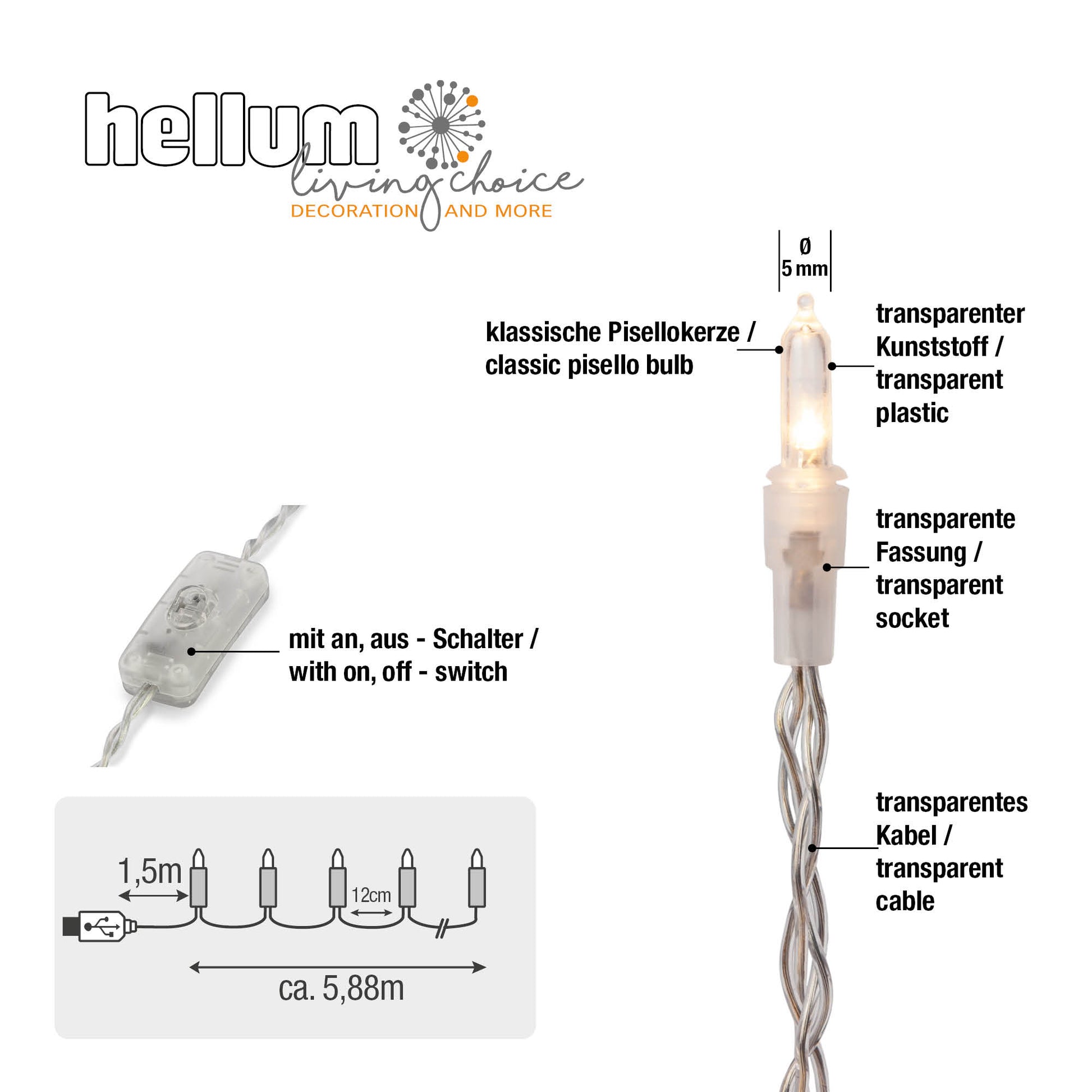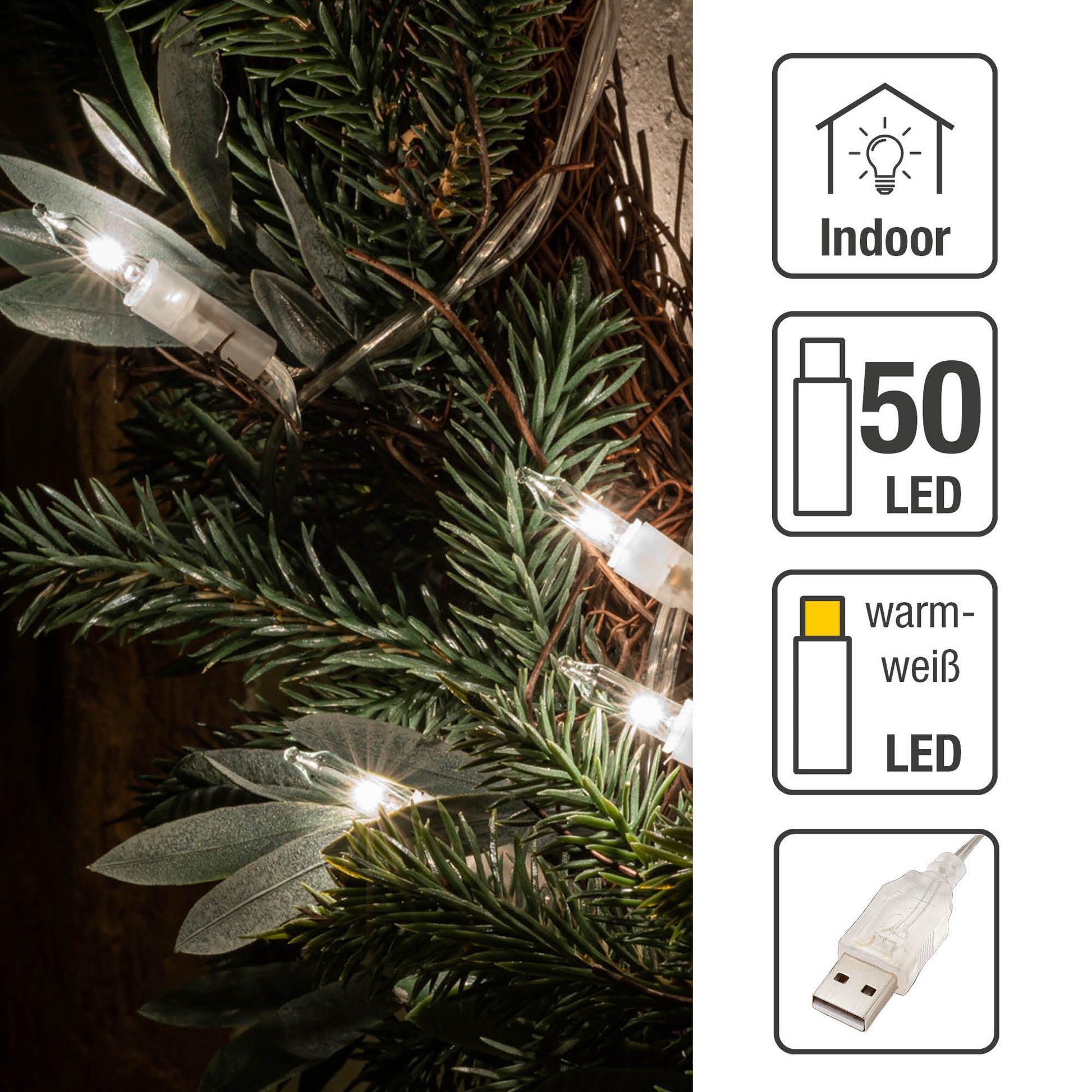 50-tlg. LED-Lichterkette, warm-weiß, transparentes Kabel, USB -Anschluss