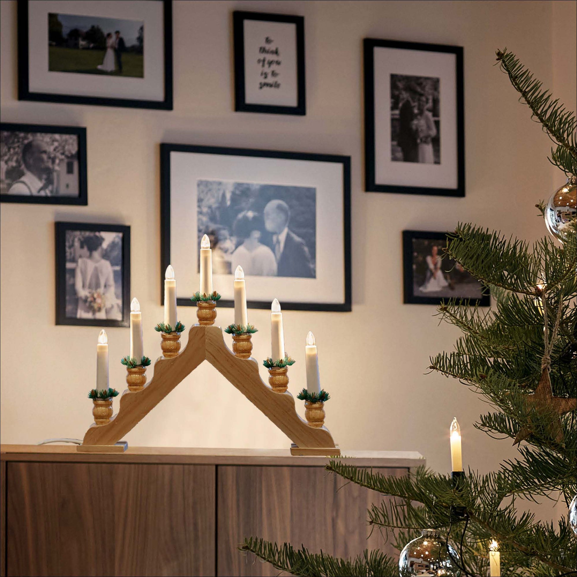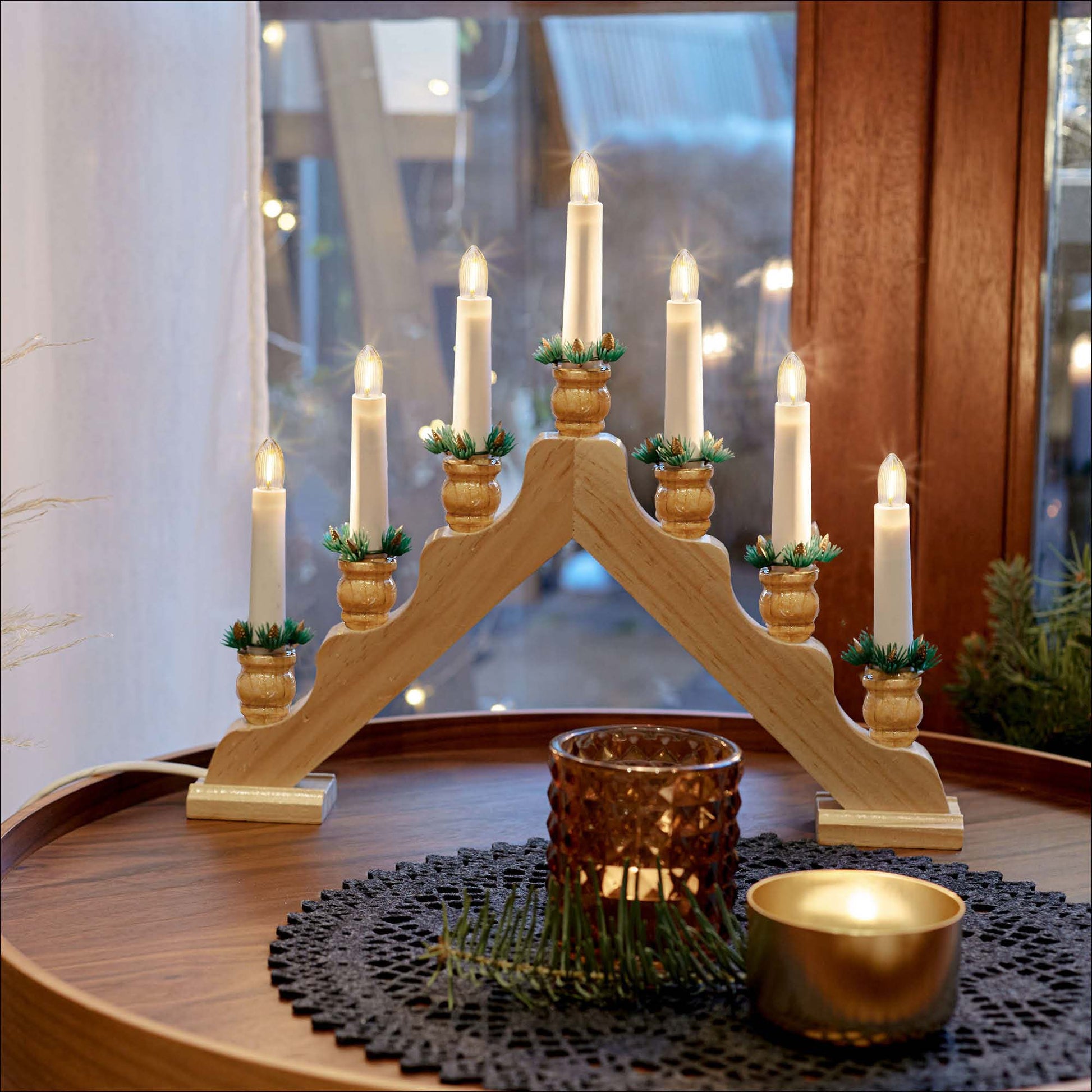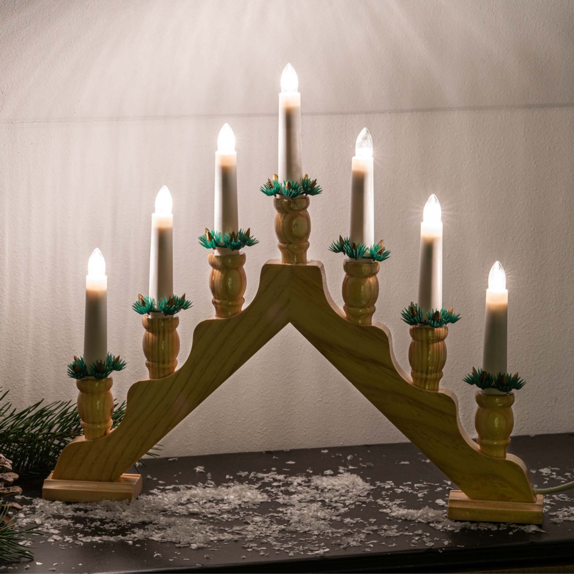 Der wunderschöne weihnachtliche Holzleuchter zeichnet sich aus durch sein klassisches Design kombiniert mit feinen Zierelementen. Seine 7 Riffelkerzen verströmen ein angenehmes Licht, das sogleich Wohlfühlatmosphäre hervorruft. Gönnen Sie sich stimmungsvolle Stunden!