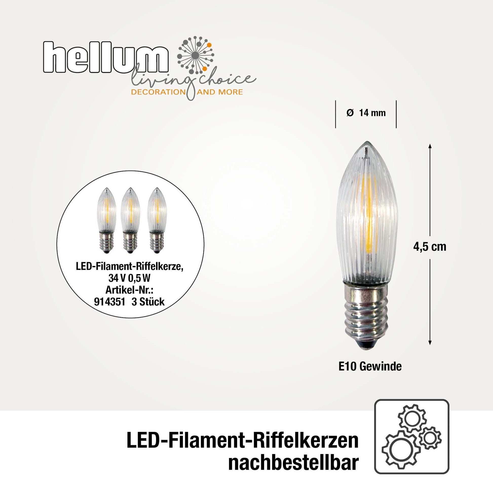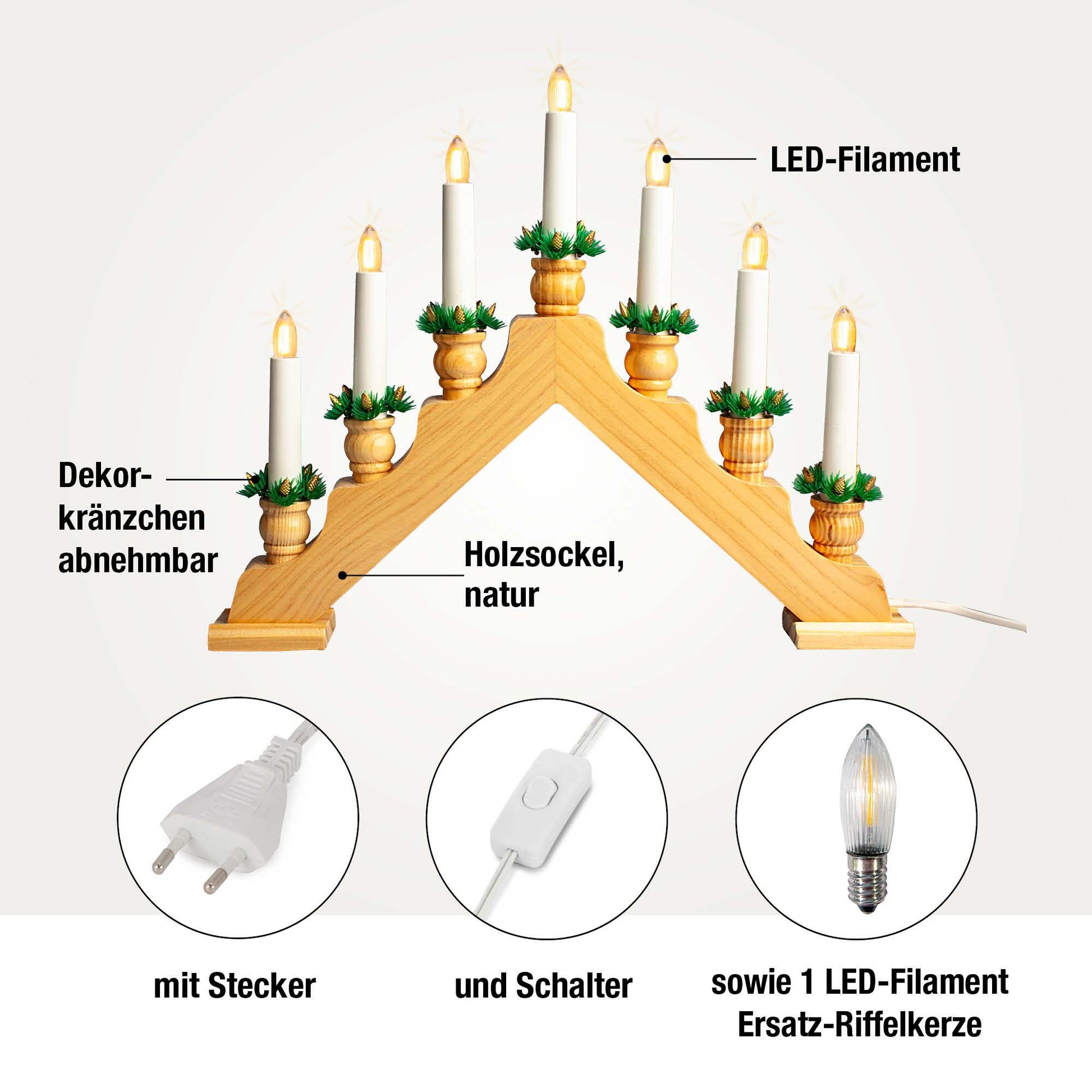 7-tlg. Holzleuchter "Pyramide", natur, mit Dekokränzchen, LED Filament Steckerzuleitung 1,5 m