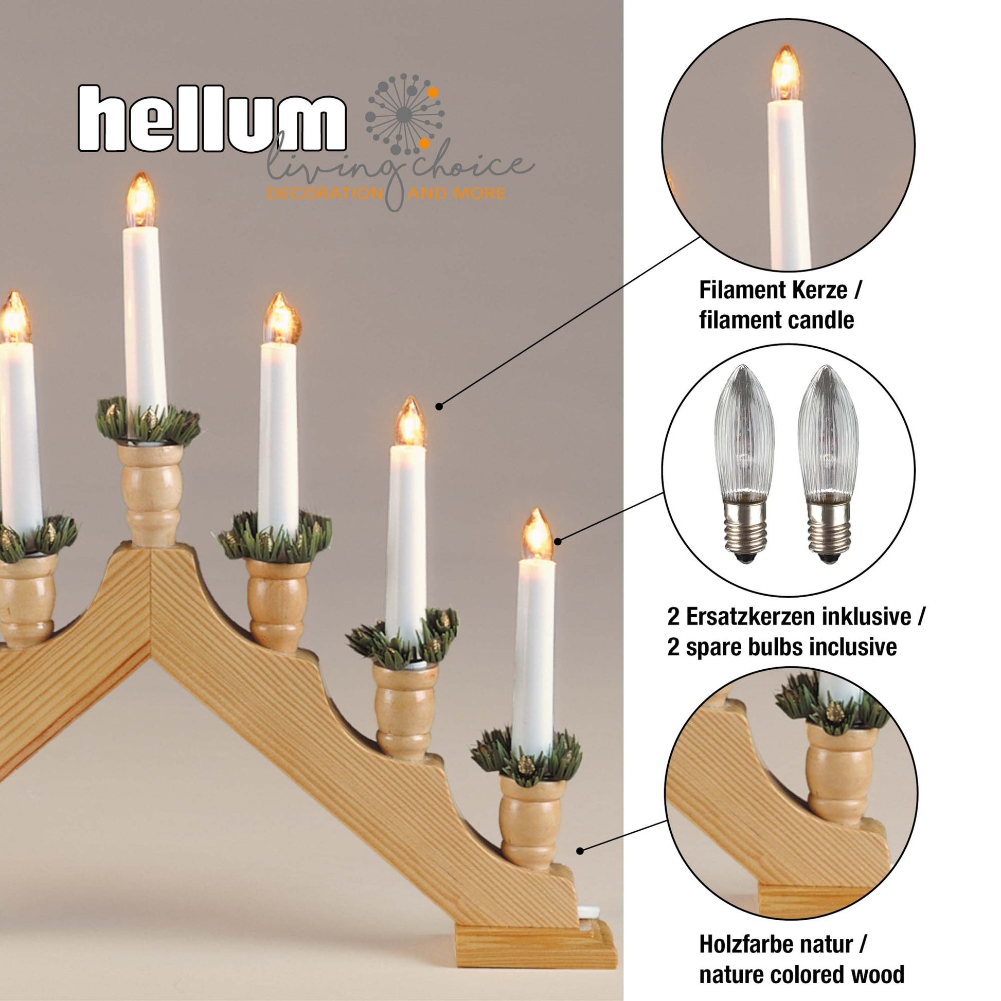 Der wunderschöne weihnachtliche Holzleuchter zeichnet sich aus durch sein klassisches Design kombiniert mit feinen Zierelementen. Seine 7 Glühdrahtriffelkerzen verströmen ein angenehmes Licht, das sogleich Wohlfühlatmosphäre hervorruft. Gönnen Sie sich stimmungsvolle Stunden!
