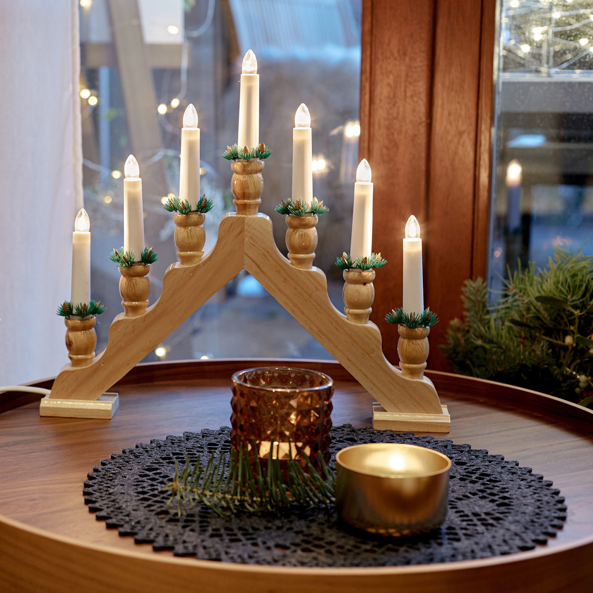 7-tlg. Holzleuchter "Pyramide", natur, mit Dekokränzchen, Steckerzuleitung 1,5 m_873207