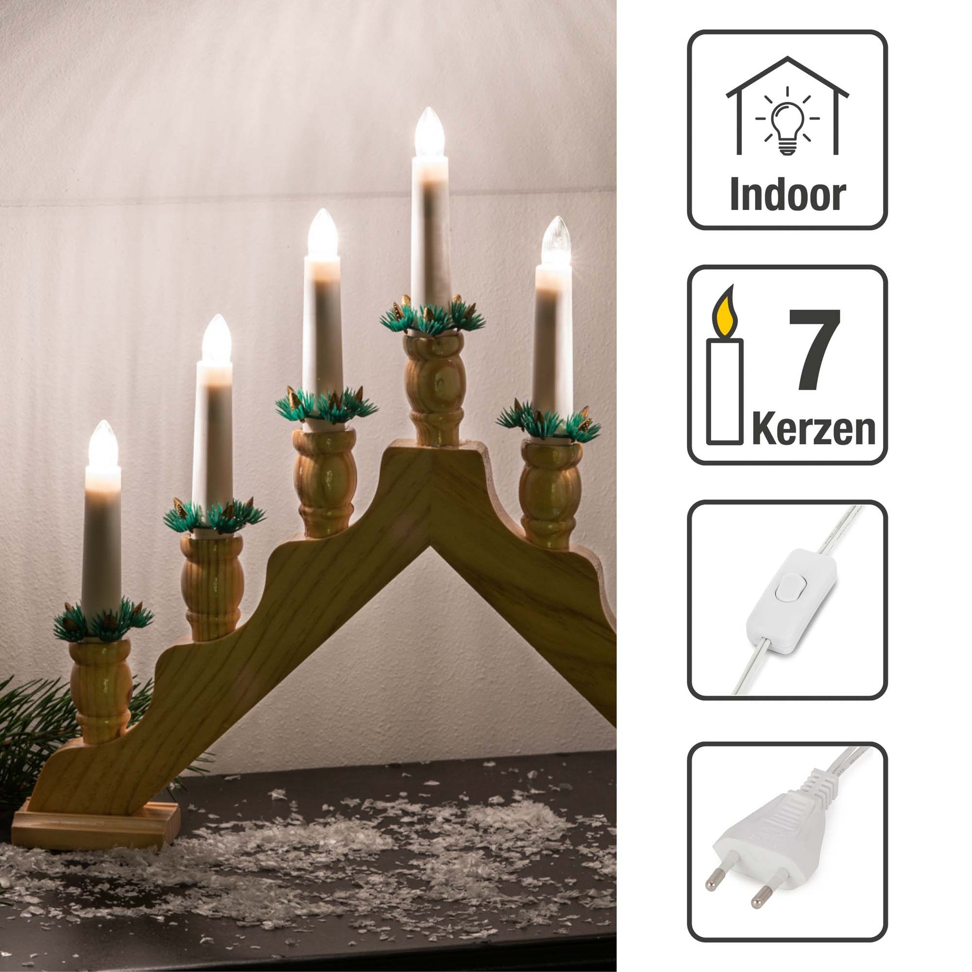 Der wunderschöne weihnachtliche Holzleuchter zeichnet sich aus durch sein klassisches Design kombiniert mit feinen Zierelementen. Seine 7 Glühdrahtriffelkerzen verströmen ein angenehmes Licht, das sogleich Wohlfühlatmosphäre hervorruft. Gönnen Sie sich stimmungsvolle Stunden!