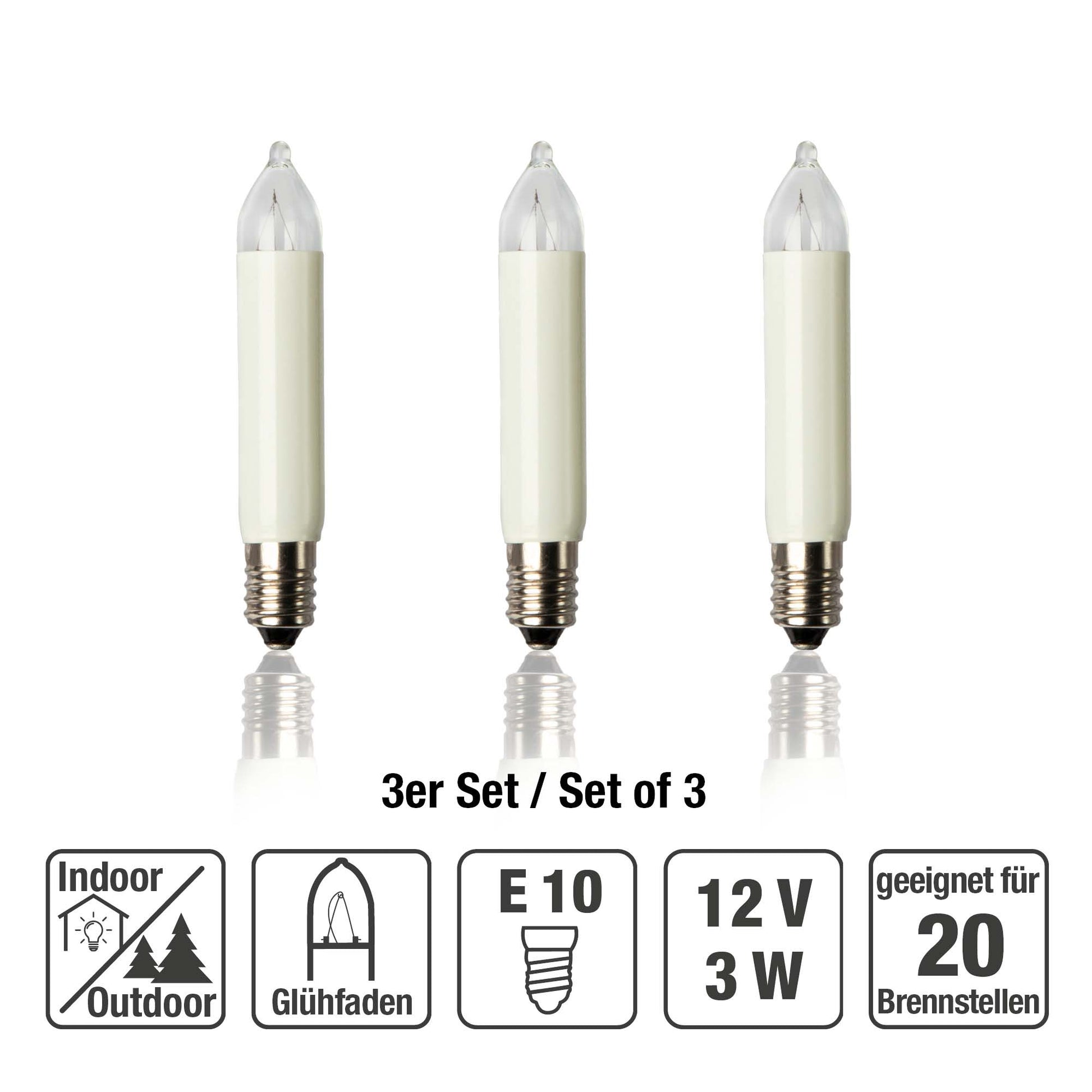 Ersatzkerzen Lichterkette 12V 3W für Lichterketten & Schwibbogen, 3 Stk Kleinschaftkerzen E10 für 20 Brennstellen innen & außen 933031
