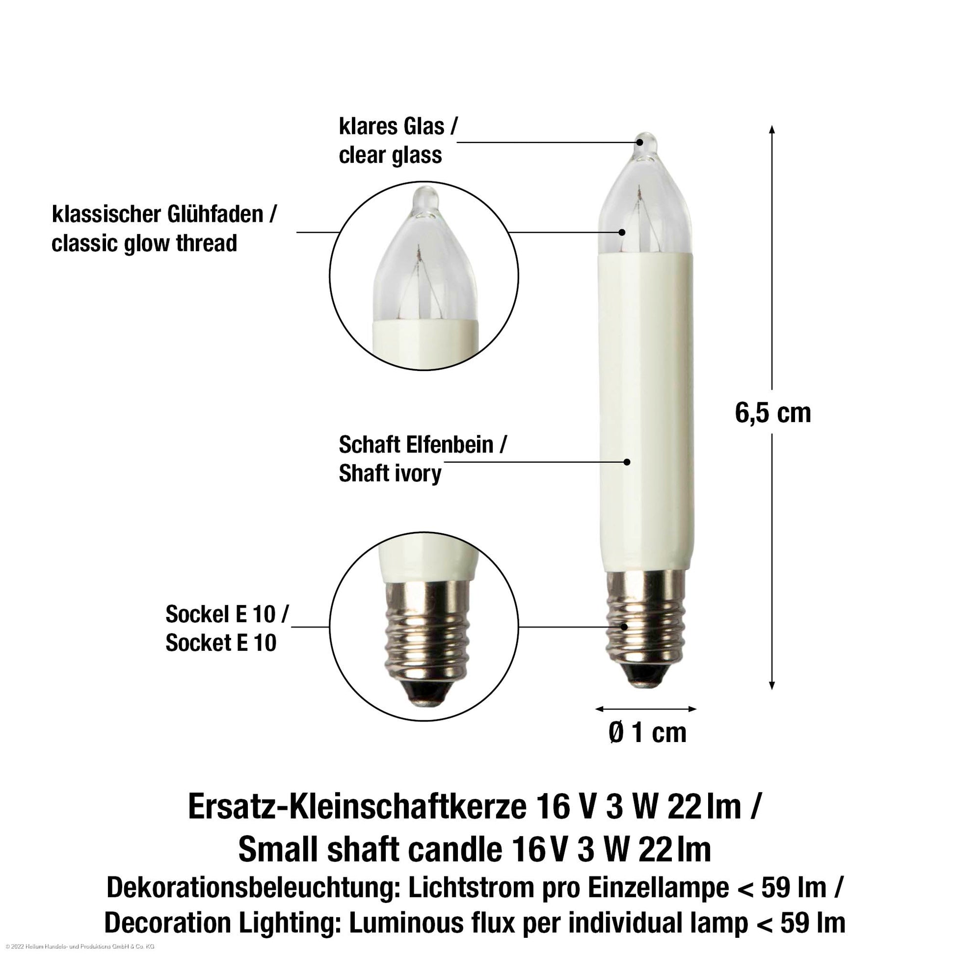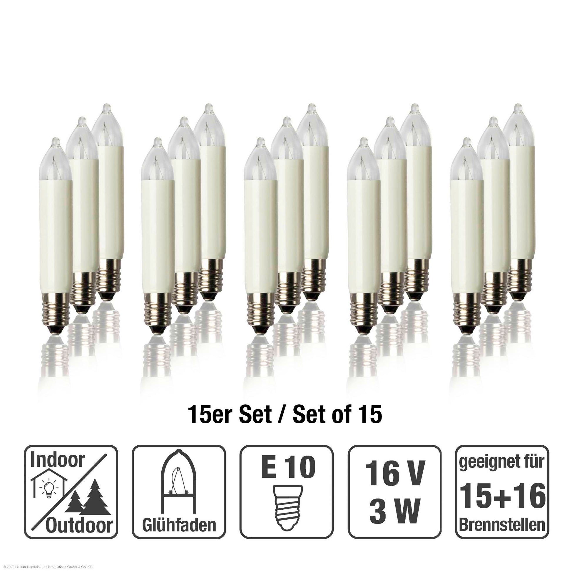 Ersatzkerzen Lichterkette 16V 3W für Lichterketten & Schwibbogen, 15 Stk Kleinschaftkerzen E10 für 15/16 Brennstellen innen & außen 151398