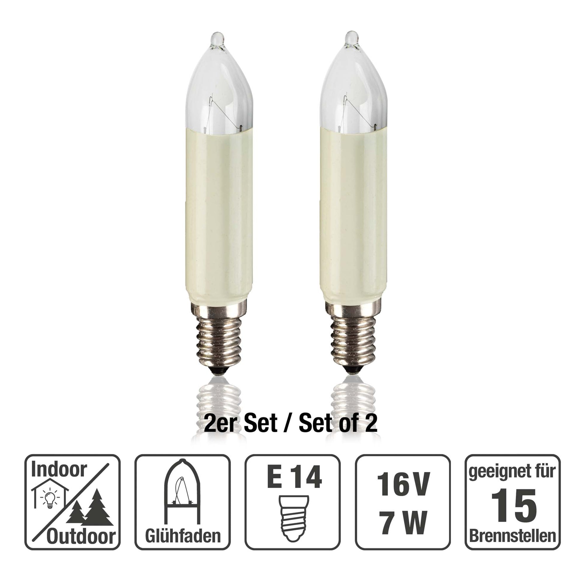 Ersatzkerzen Lichterkette 16V 7W für Lichterketten & Schwibbogen, 2 Stk Schaftkerzen E14 für 15 Brennstellen innen & außen 905045