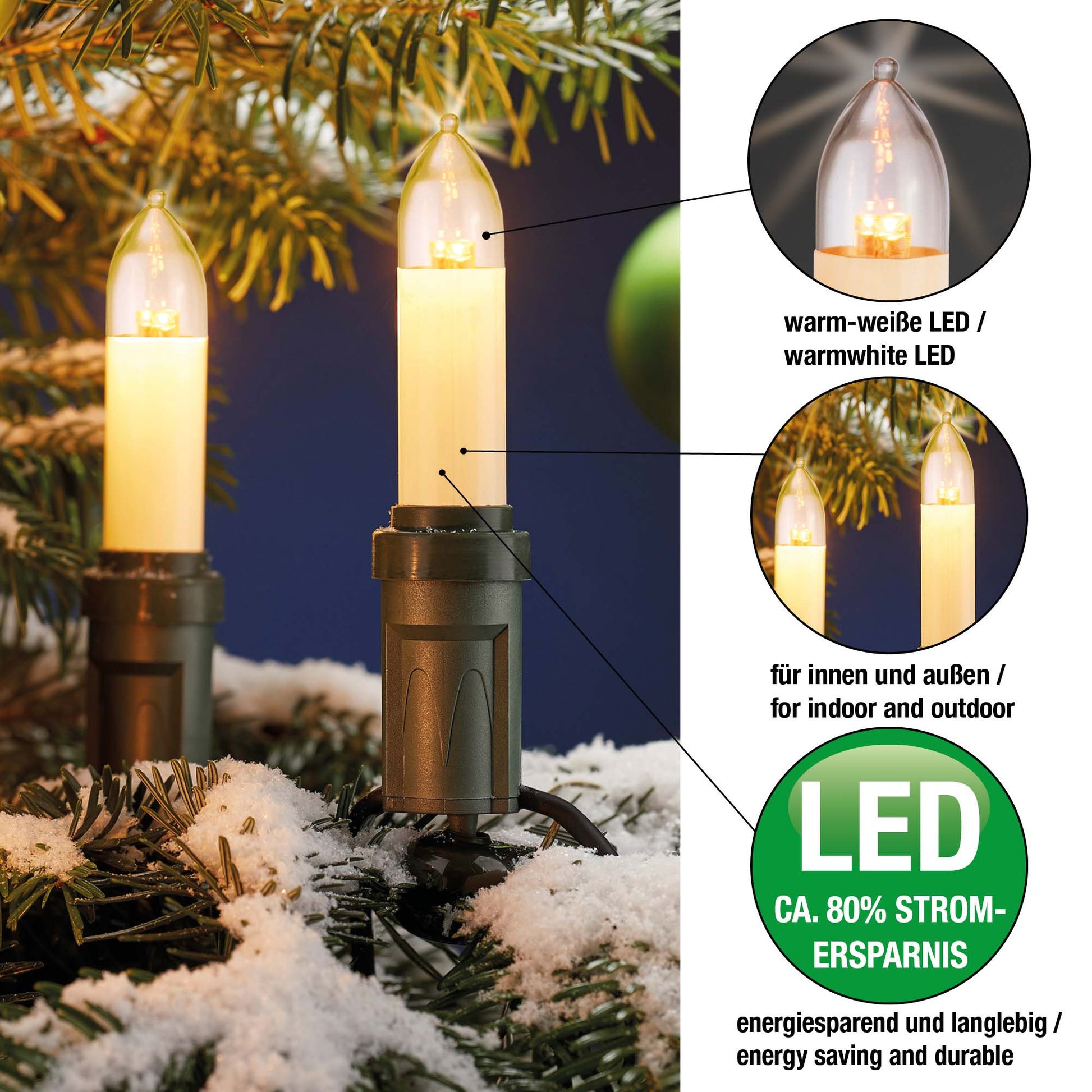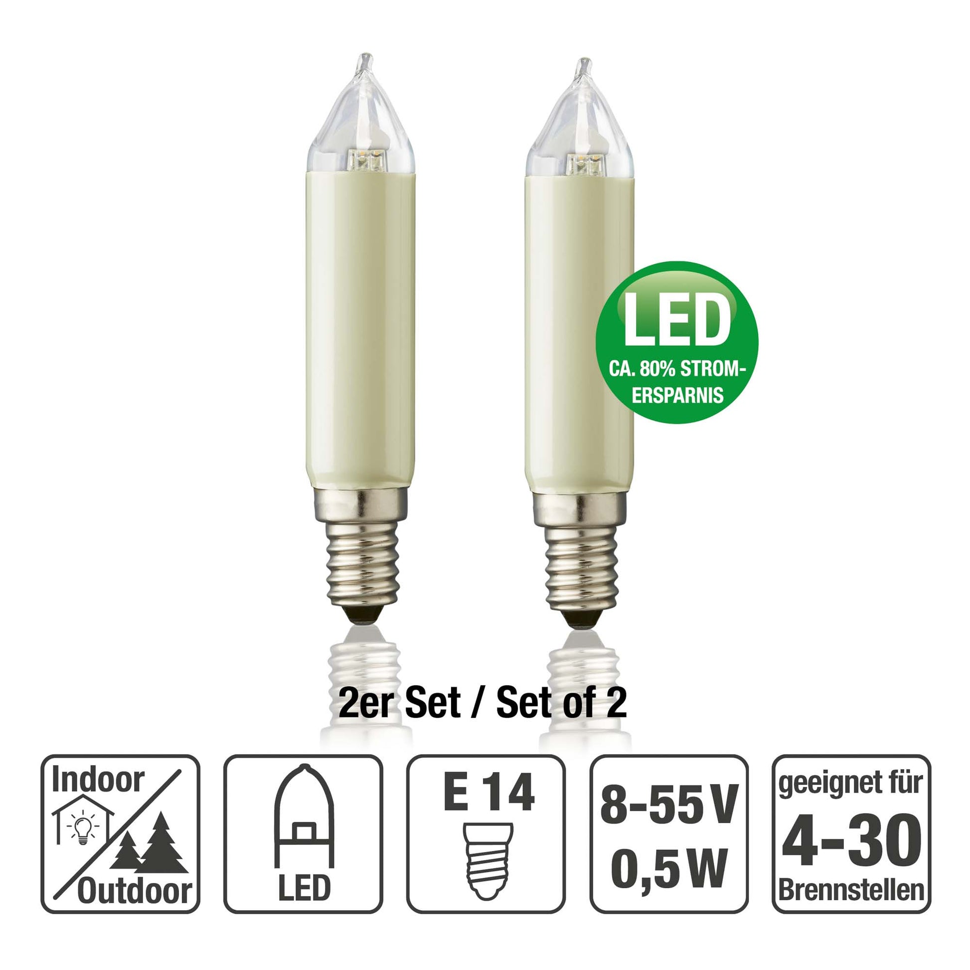 Ersatzkerzen Lichterkette LED 8-55V 0,6W für Lichterketten & Schwibbogen, 2 Stk Schaftkerzen E14 für 4-30 Brennstellen innen & außen 904949