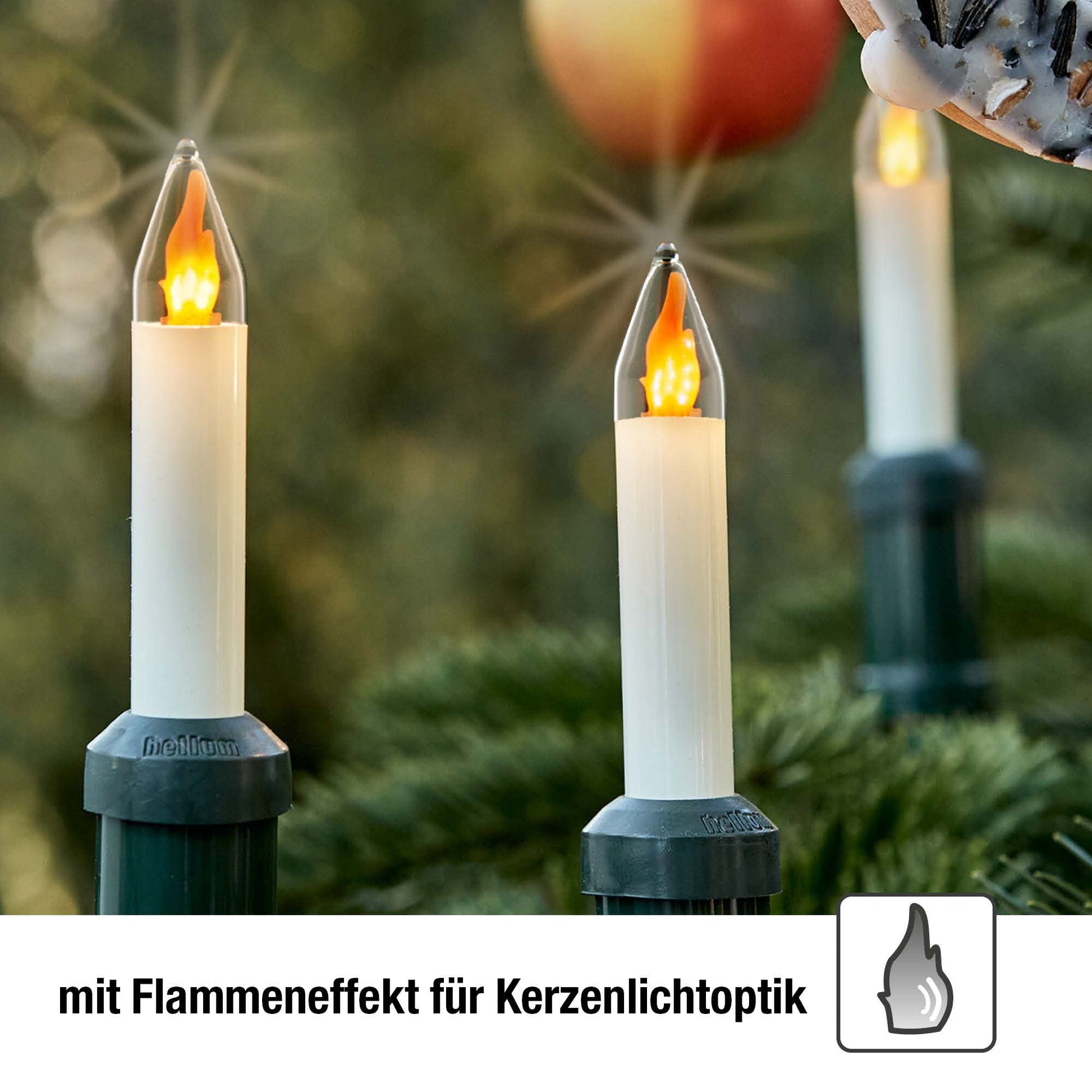 Lichterkette Weihnachtsbaum LED Filament mit Flammeneffekt, außen 15 teilig, Made in Germany, Schaftkerzen, inkl. 1 Ersatzkerze