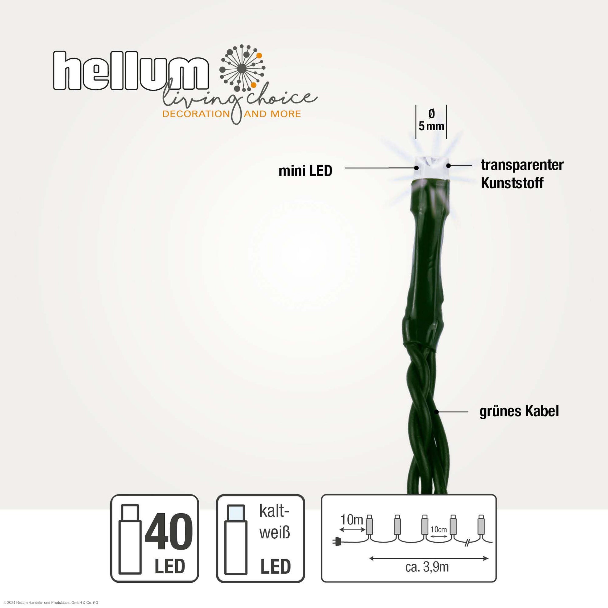 Die Hellum LED-Lichterkette mit 40 kaltweißen LEDs eignet sich für den Innen- und Außenbereich und sorgt für eine klare, brillante Lichtwirkung. Mit einer beleuchteten Länge von 3,90 m bietet sie die ideale Größe für Weihnachtsbäume, Fensterbereiche, Geländer oder dekorative Arrangements. Die strombetriebene Lichterkette ist mit einem praktischen Timer ausgestattet, der das automatische Ein- und Ausschalten komfortabel ermöglicht. Das grüne Kabel fügt sich unauffällig in Tannengrün ein und sorgt für ein harmonisches Gesamtbild. Dank energiesparender LED-Technik, einer Helligkeit von unter 59 Lumen und robuster Verarbeitung eignet sich die Lichterkette optimal für den täglichen Einsatz in der Advents- und Winterzeit.