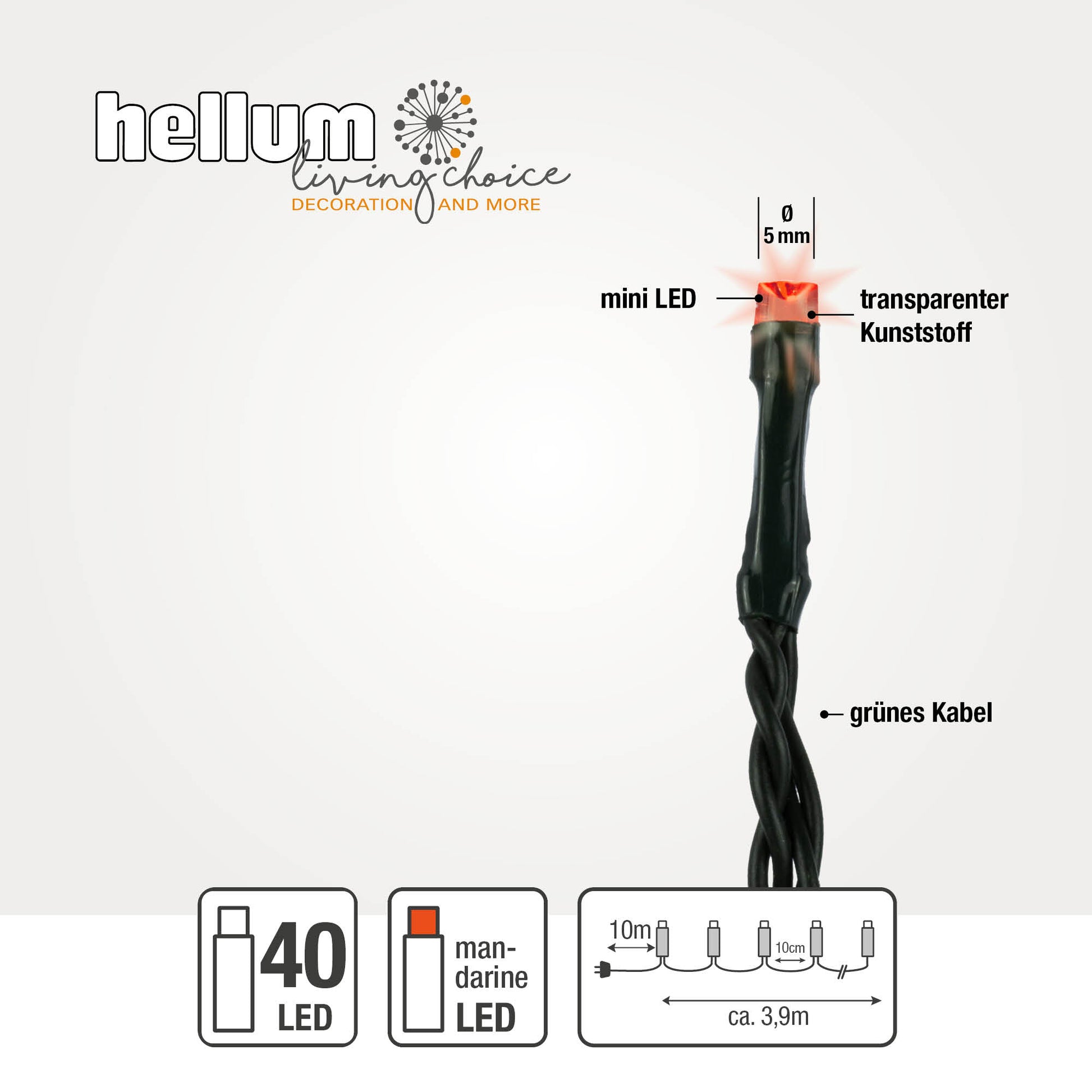 Die Hellum LED-Lichterkette mit 40 warm leuchtenden LEDs in der Lichtfarbe Mandarine eignet sich für den Einsatz im Innen- und Außenbereich und sorgt für eine stimmungsvolle, gemütliche Beleuchtung. Mit einer beleuchteten Länge von 3,90 m ist sie ideal für Weihnachtsbäume, Fensterdekorationen, Geländer oder andere winterliche Arrangements. Die Lichterkette ist strombetrieben und mit einem praktischen Timer ausgestattet, der das automatische Ein- und Ausschalten erleichtert. Das grüne Kabel fügt sich dezent in Tannengrün ein und ermöglicht eine harmonische Optik. Dank langlebiger LED-Technik, robuster Verarbeitung und einfacher Handhabung ist diese Lichterkette eine zuverlässige Wahl für eine atmosphärische Weihnachtsbeleuchtung.