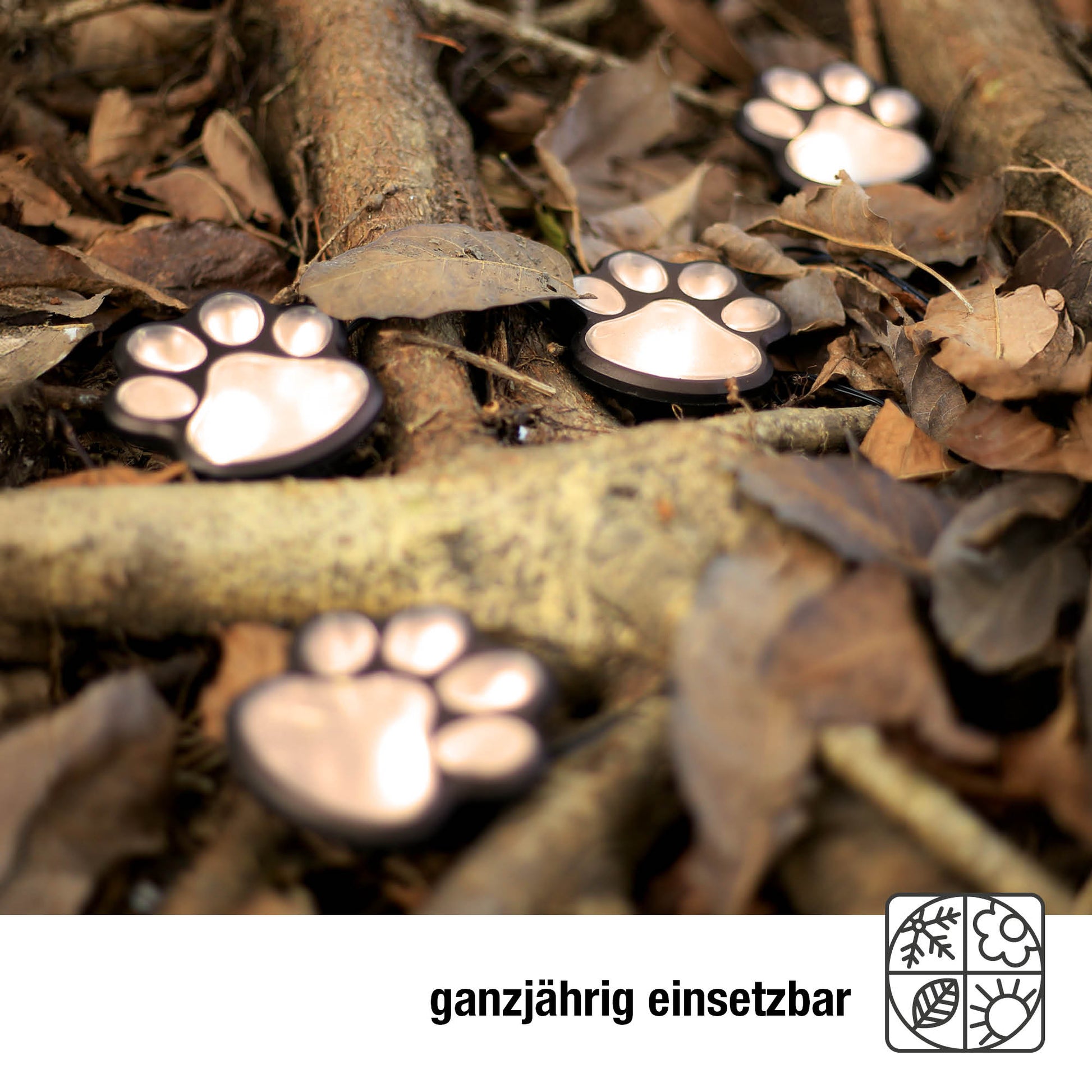 Dank der praktischen Erdspieße lassen sich die solarbetriebenen Pfoten mühelos und ohne Stromanschluss platzieren. Tagsüber laden sie sich durch Sonnenenergie auf und leuchten am Abend ganz von selbst – umweltfreundlich, kabellos und zuverlässig. Die wetterfesten Materialien ermöglichen den ganzjährigen Einsatz im Außenbereich.