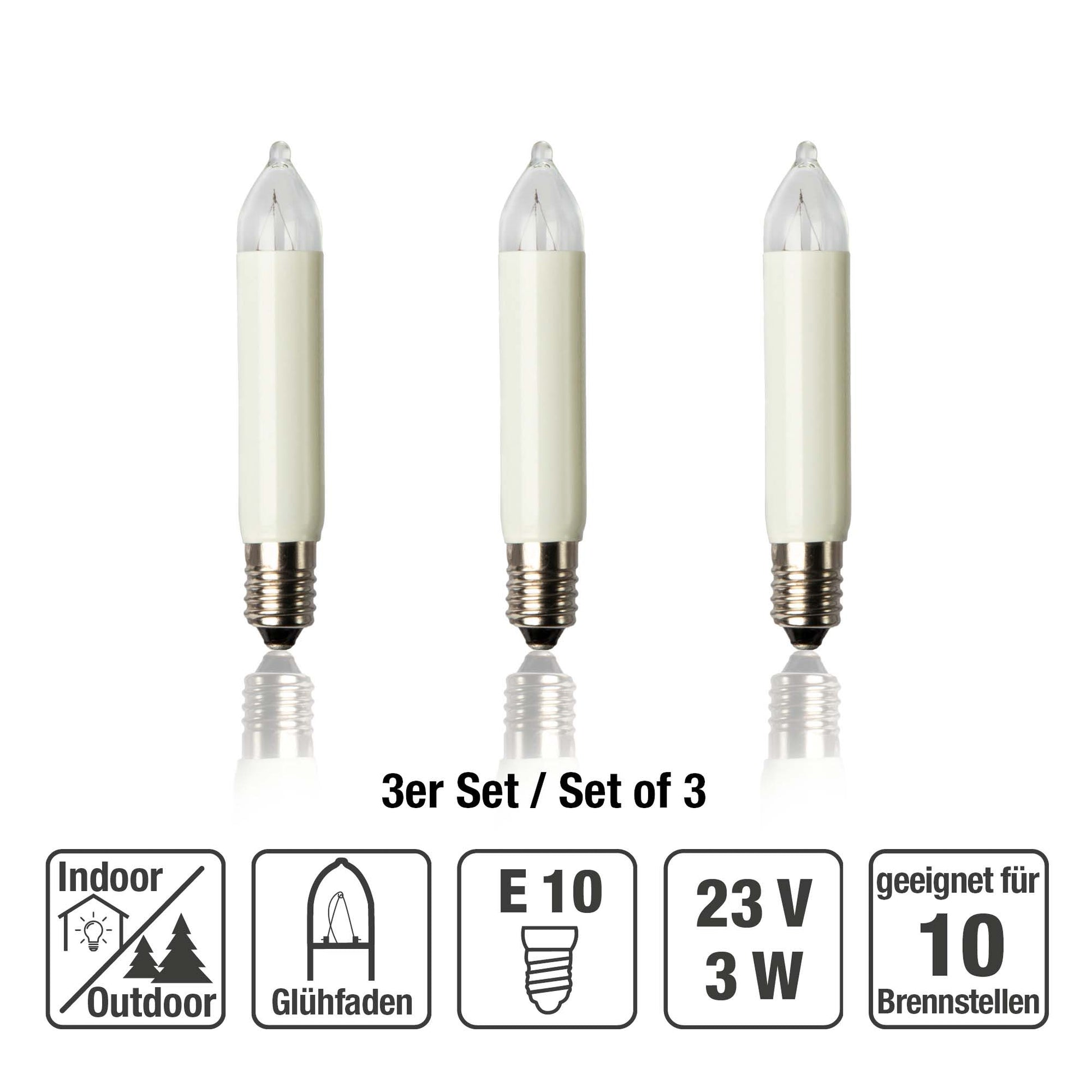 Ersatzkerzen Lichterkette 23V 3W für Lichterketten & Schwibbogen, 3 Stk Kleinschaftkerzen E10 für 10 Brennstellen innen & außen 938036