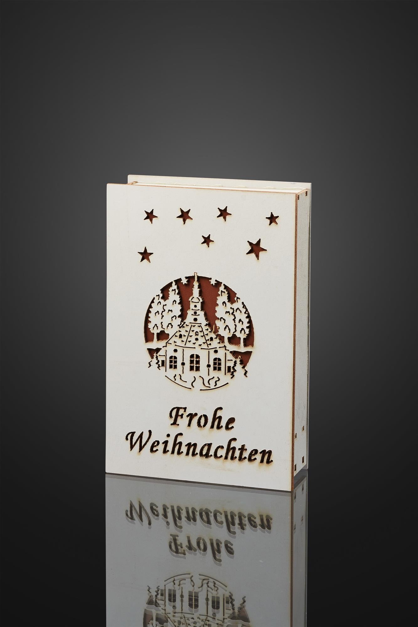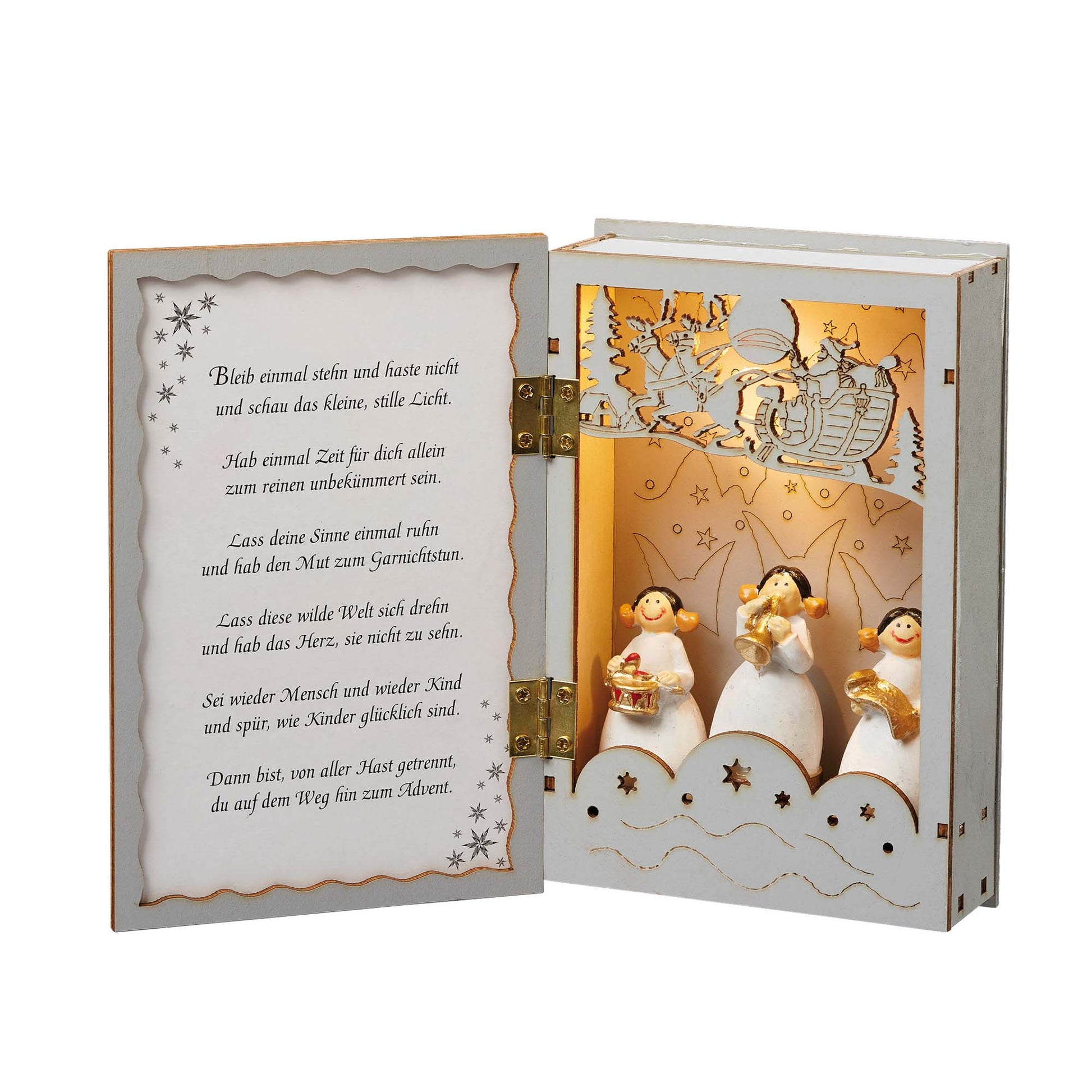 In diesem weihnachtlichen Deko-Buch steckt mehr, als man auf den ersten Blick vermuten kann: Es besticht nicht nur durch seine zeitlos-elegante Optik, sondern wartet zudem mit einer Spieluhr auf, die weihnachtliche Musik abspielt. Die dargestellten Engel, beleuchtet durch das warmweiße Licht der LED, sorgen an jedem Ort für weihnachtliche Stimmung. Durch das integrierte Batteriefach ist das Deko-Buch quasi überall zu platzieren. Lassen Sie Ihrer Phantasie freien Lauf!