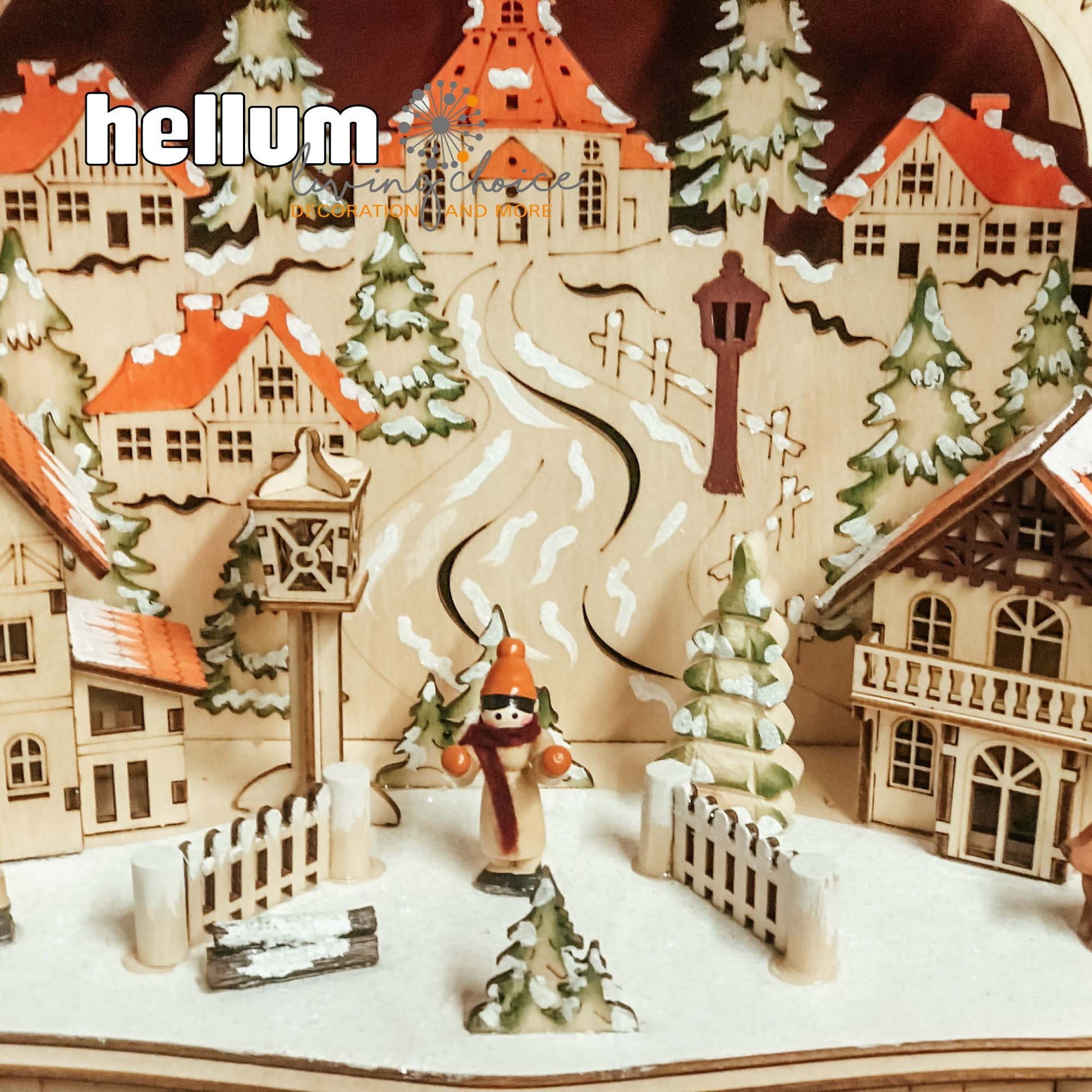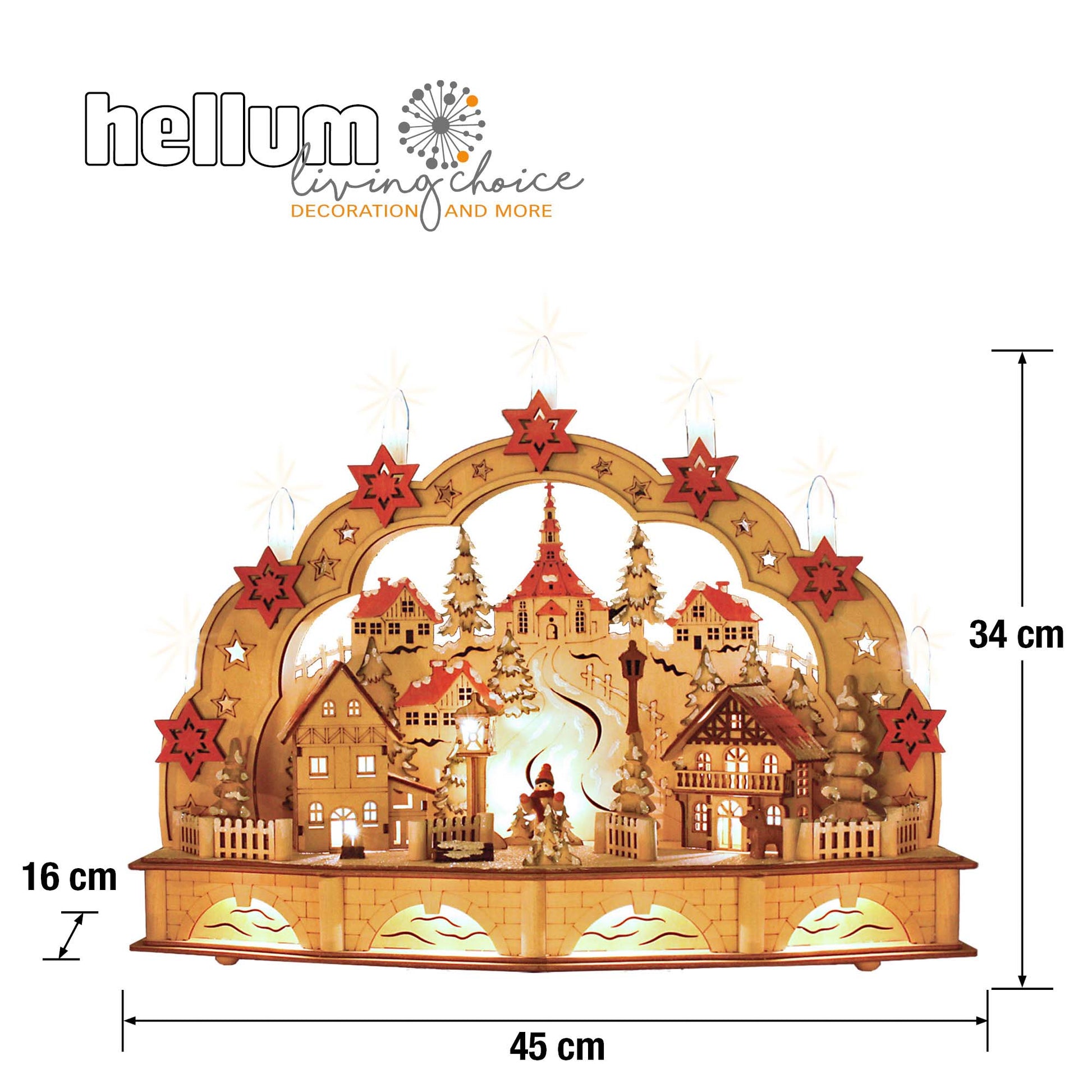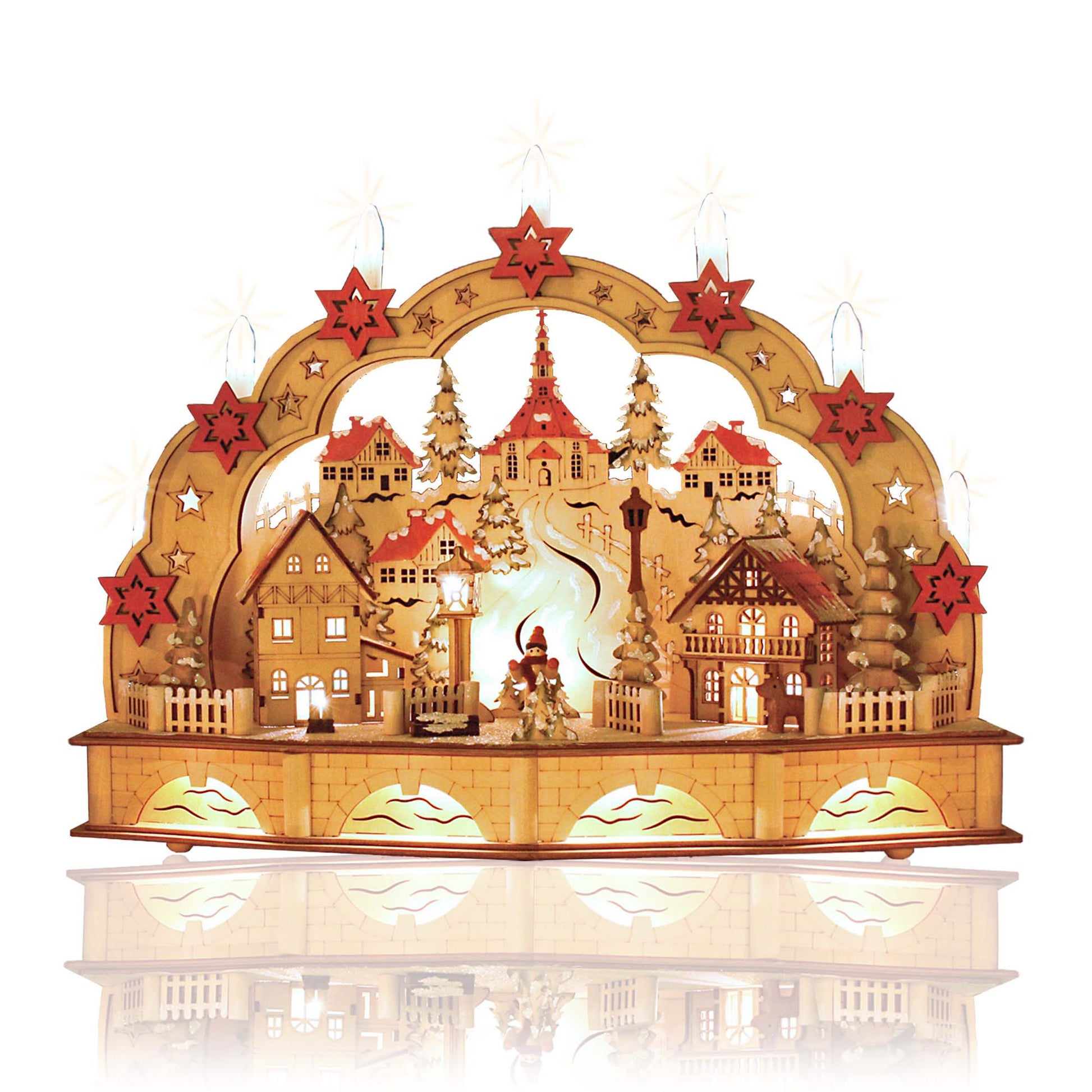 LED-Holzleuchter „Winterliches Dorf mit Seiffener Kirche", mit 6h-Timer, batteriebetrieben