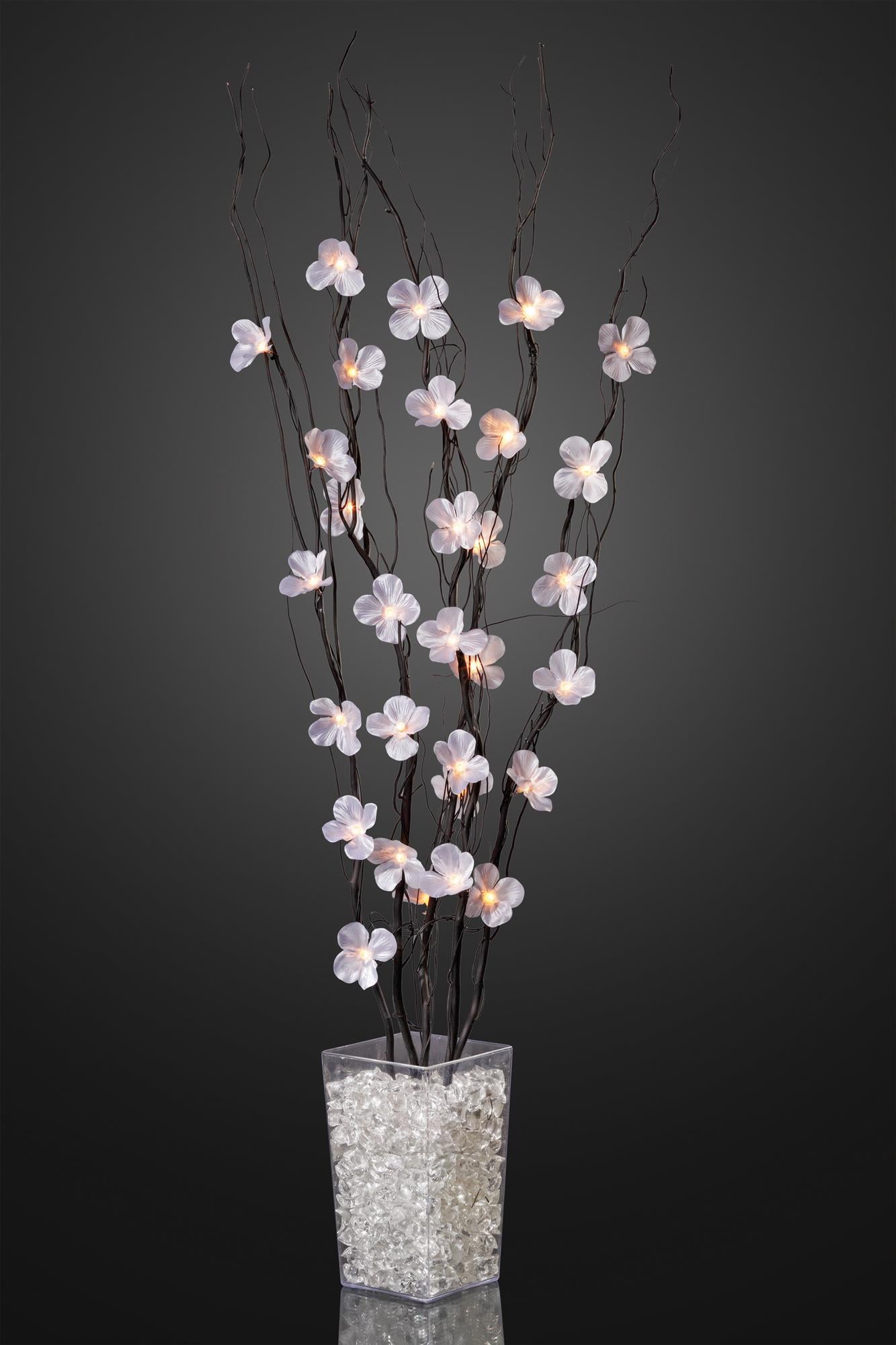 Dieser extravagante Blumenstrauß wird Sie begeistern! In die schönen zartrosanen Blüten ist jeweils eine warmweiße LED eingearbeitet. Die zarten Blütenstängel sind in zeitlosem schwarz gehalten. Besonders in einer großen Bodenvase kommen die 120 cm großen Zweige wunderbar zur Geltung (Vase nicht inklusive).