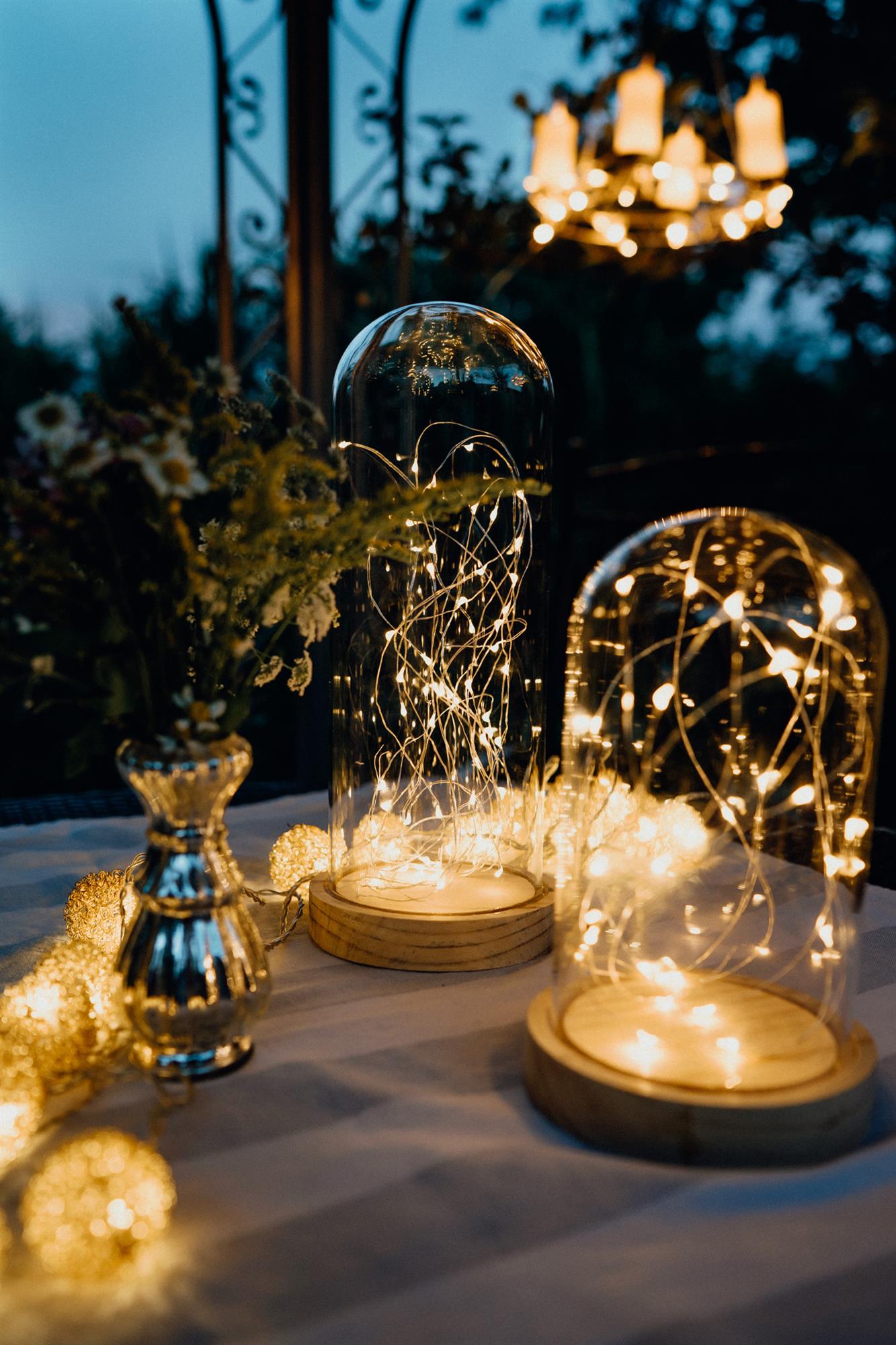 Klare Glaskuppel mit Naturholz, mit LED-Tropfenlichterkette, Leitung aus dünnem, flexiblem Metalldraht,