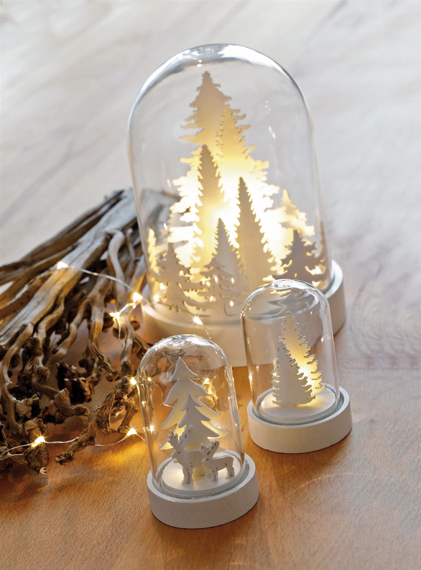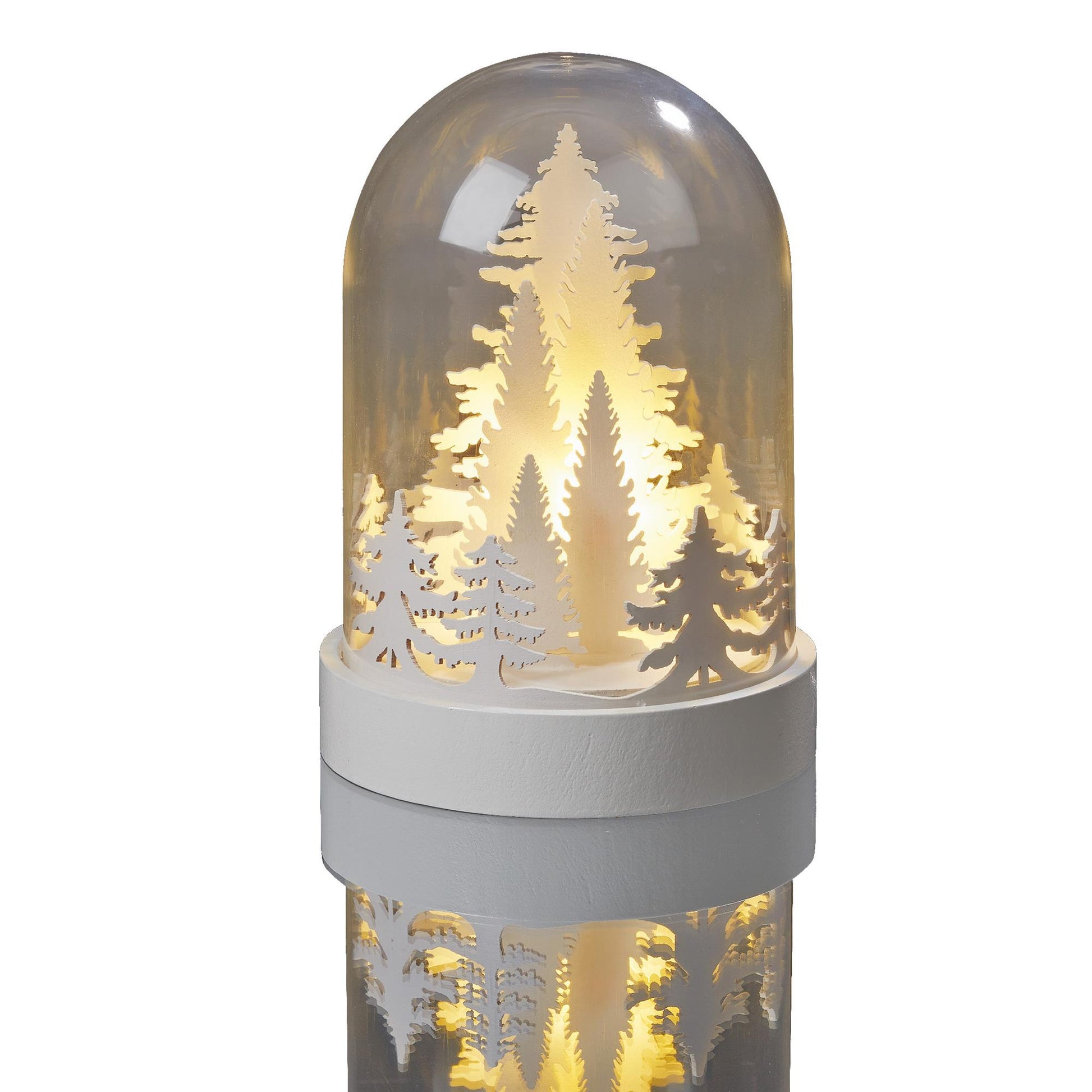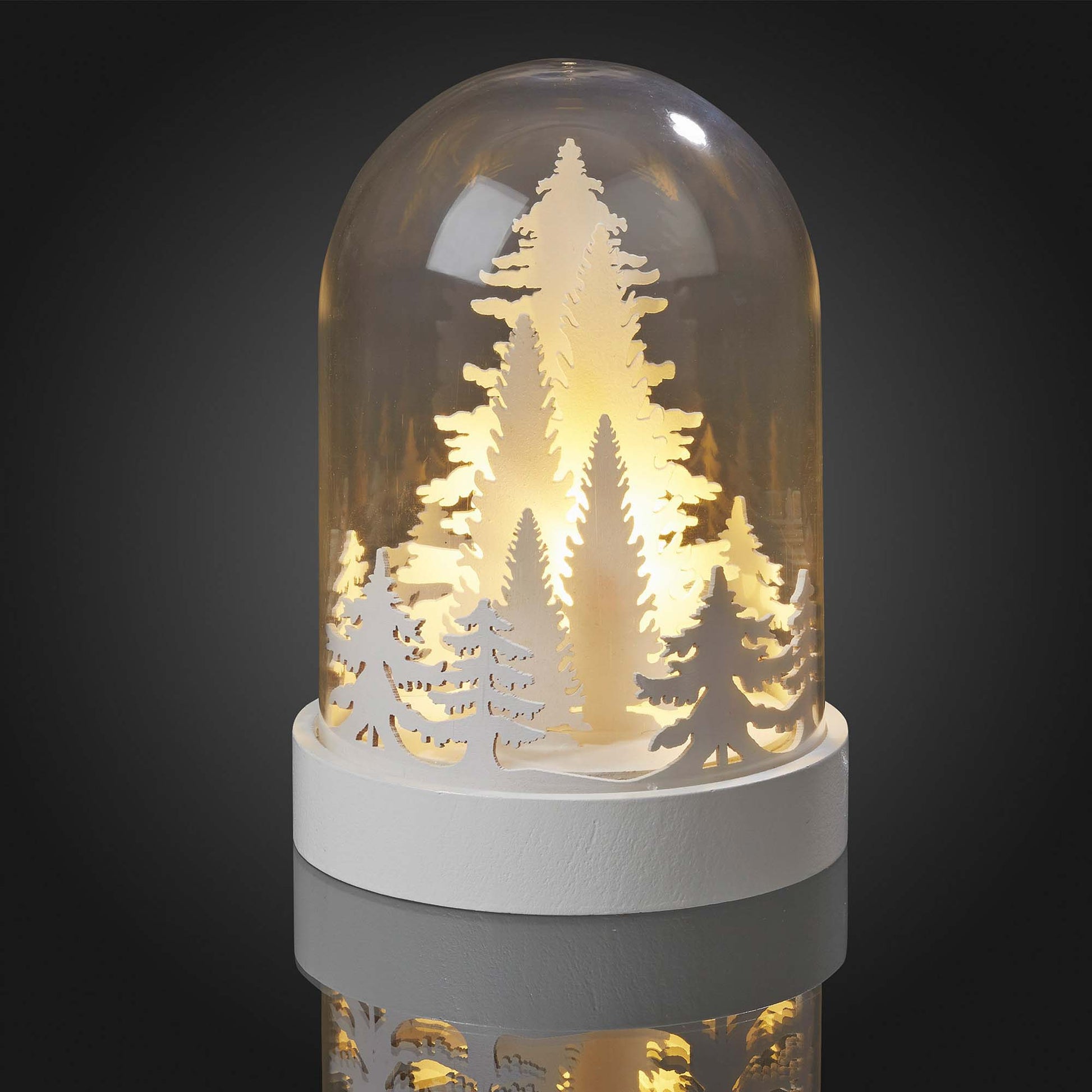 Die schlichte Deko-Glocke besticht mit ihren filigranen in weiß gehaltenen Bäumen, in Kombination mit dem angenehmen warmweißen Lichtschein der LED.