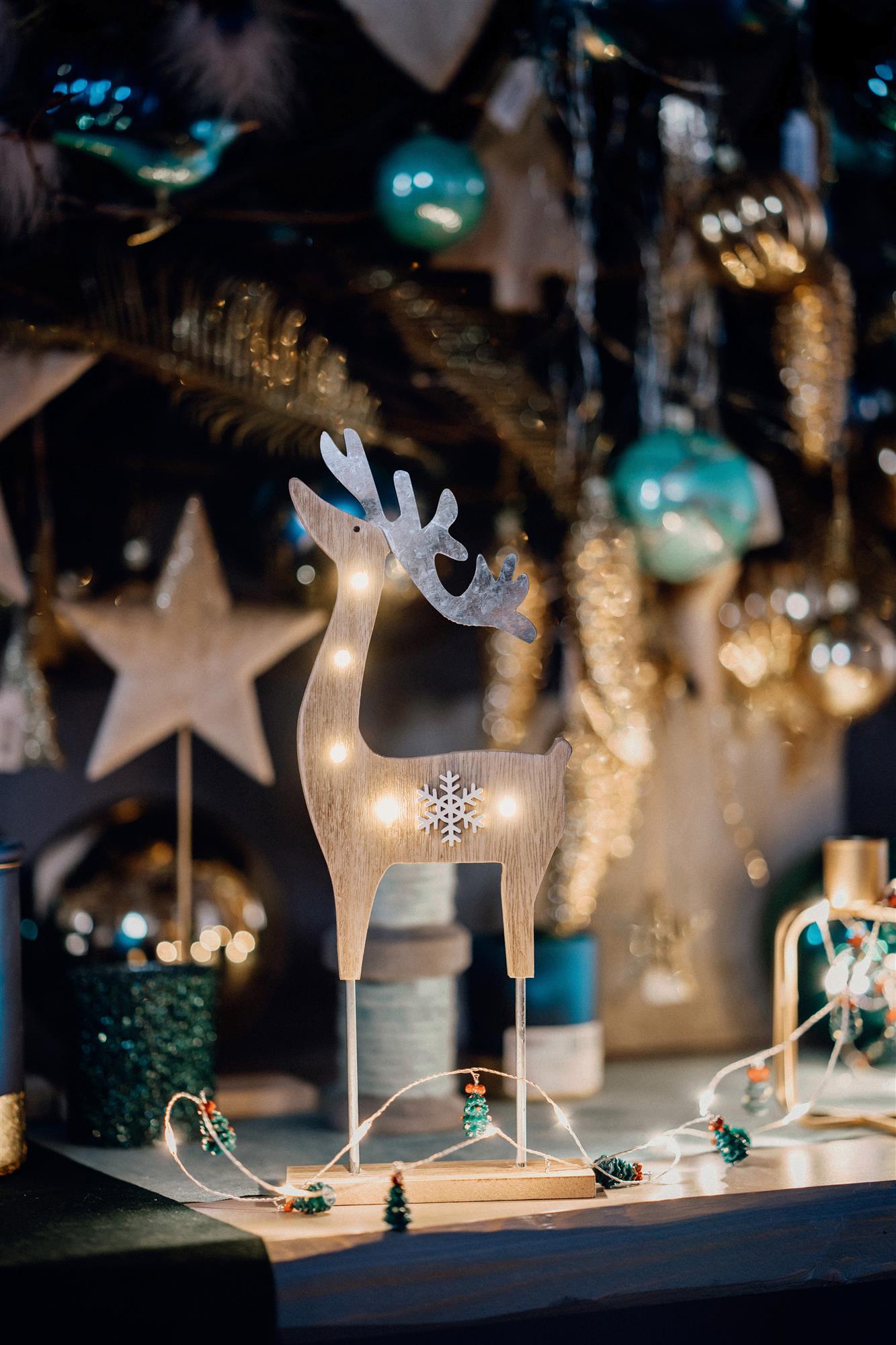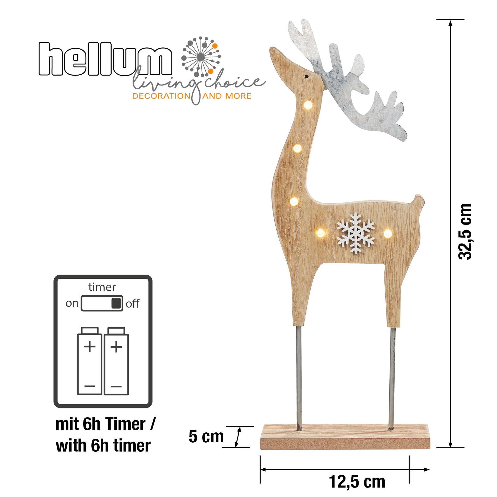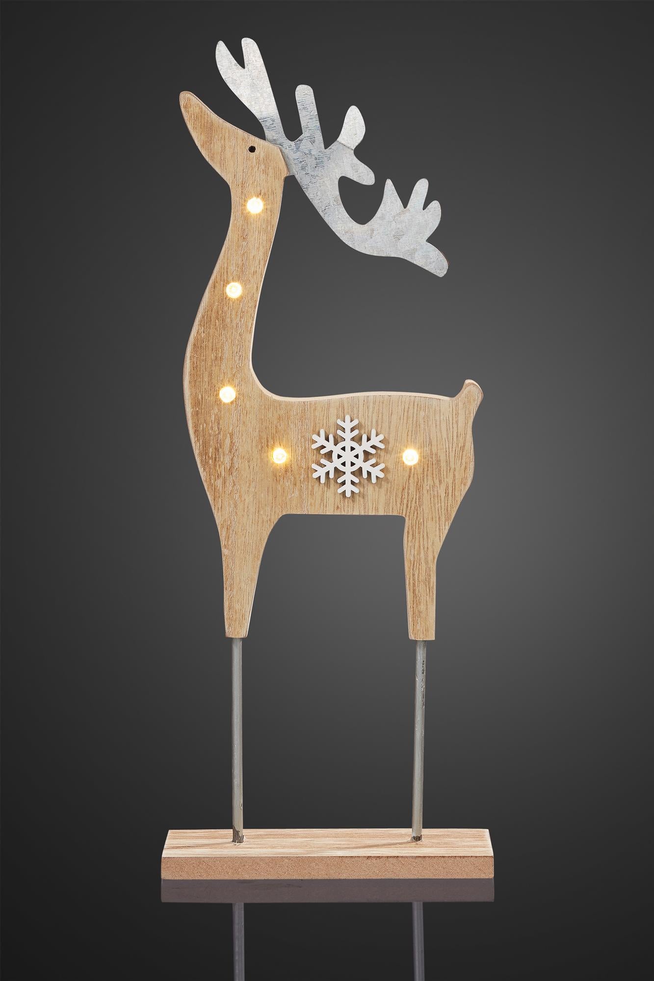 LED-Holz-Rentier mit Schneeflocke, 5 LEDs, mit Timer, batteriebetrieben