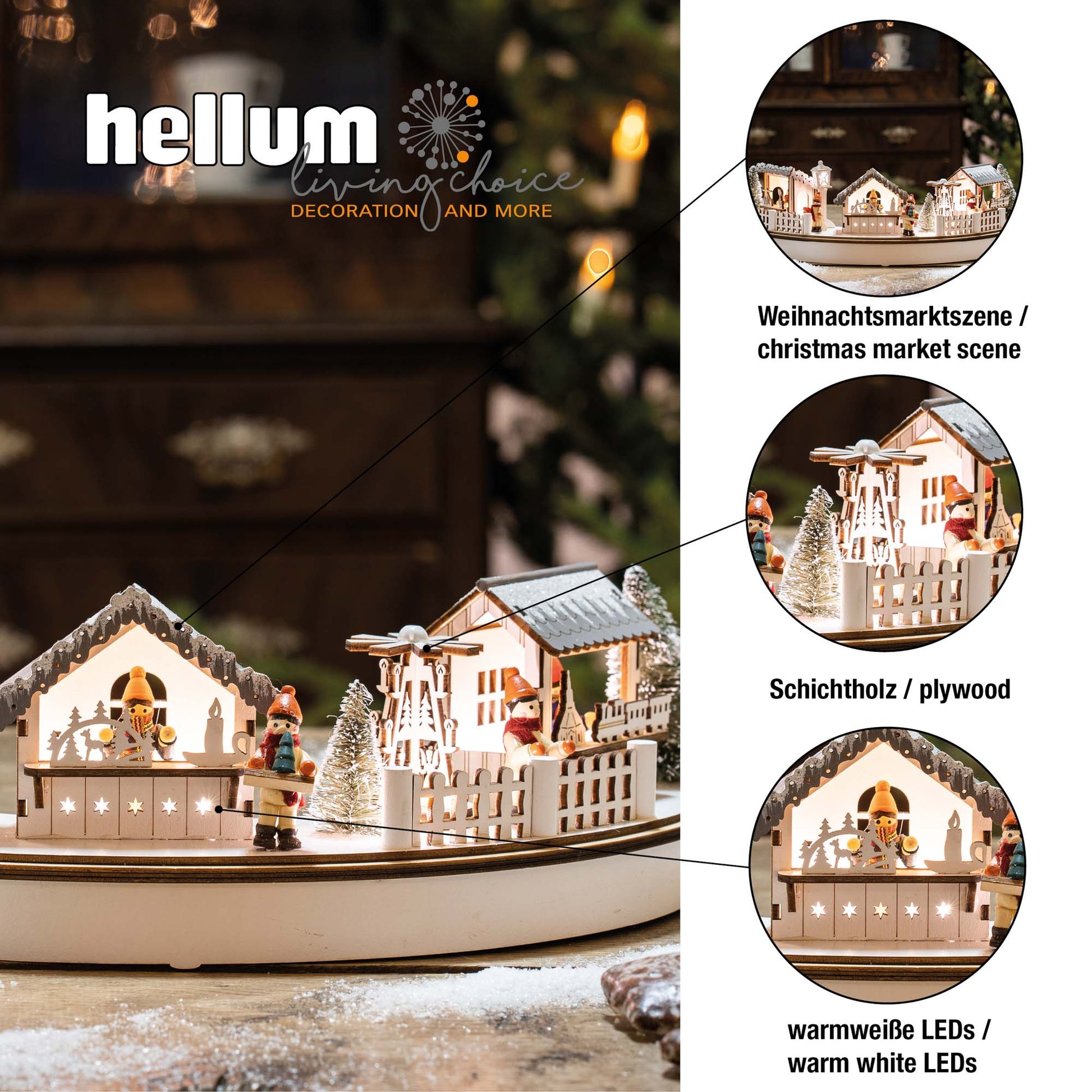 LED- Holz Stadt-Szenerie im Halbkreis, 8 LEDs ww, 39x8x18,5cm, mit 6 h Timer, batteriebetrieben.