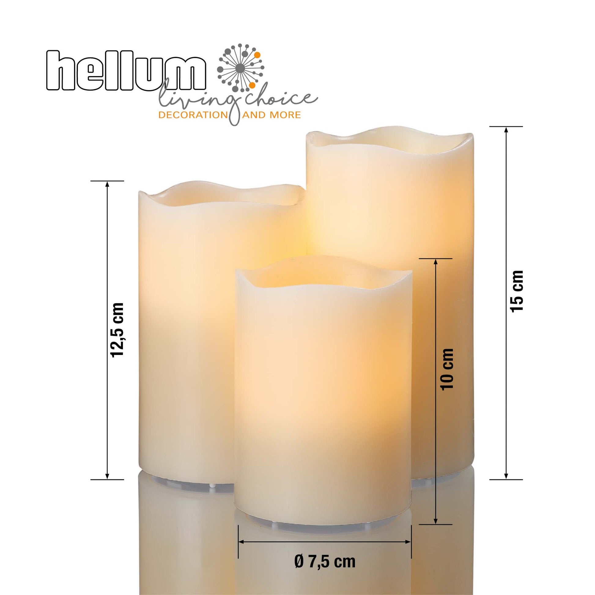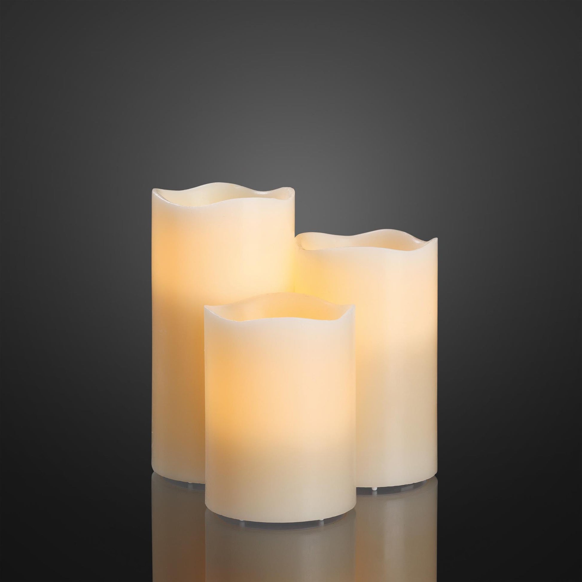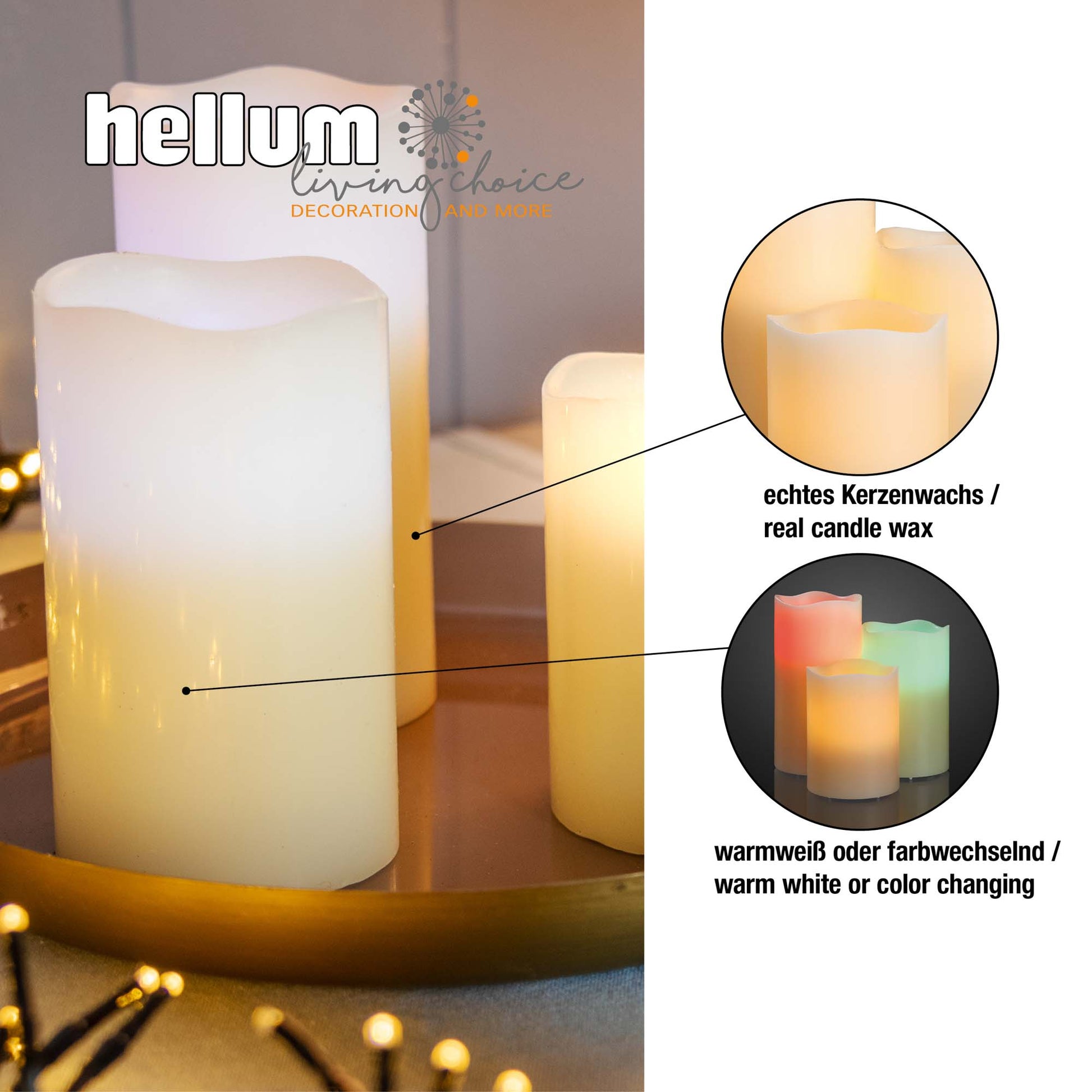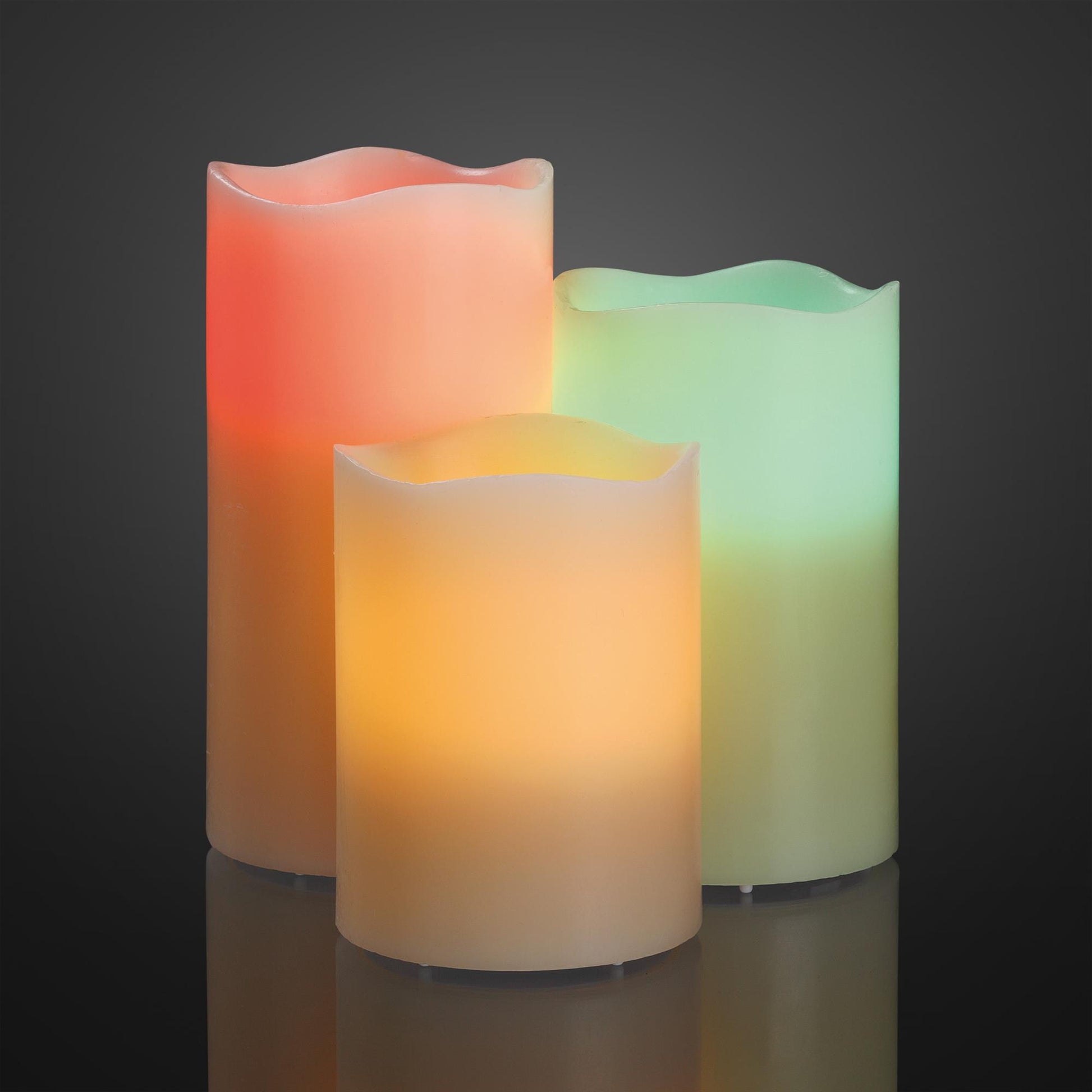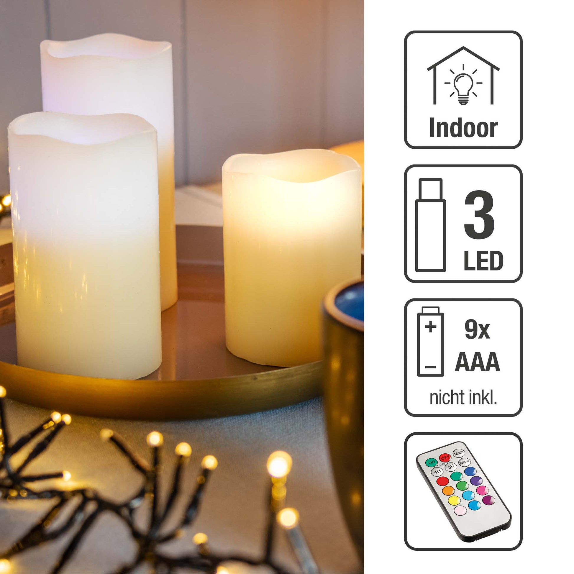 LED-Kerzen, 3er-Set, 15/12,5/10 cm hoch, weiß, RGB, Timer, FB, batteriebetrieben