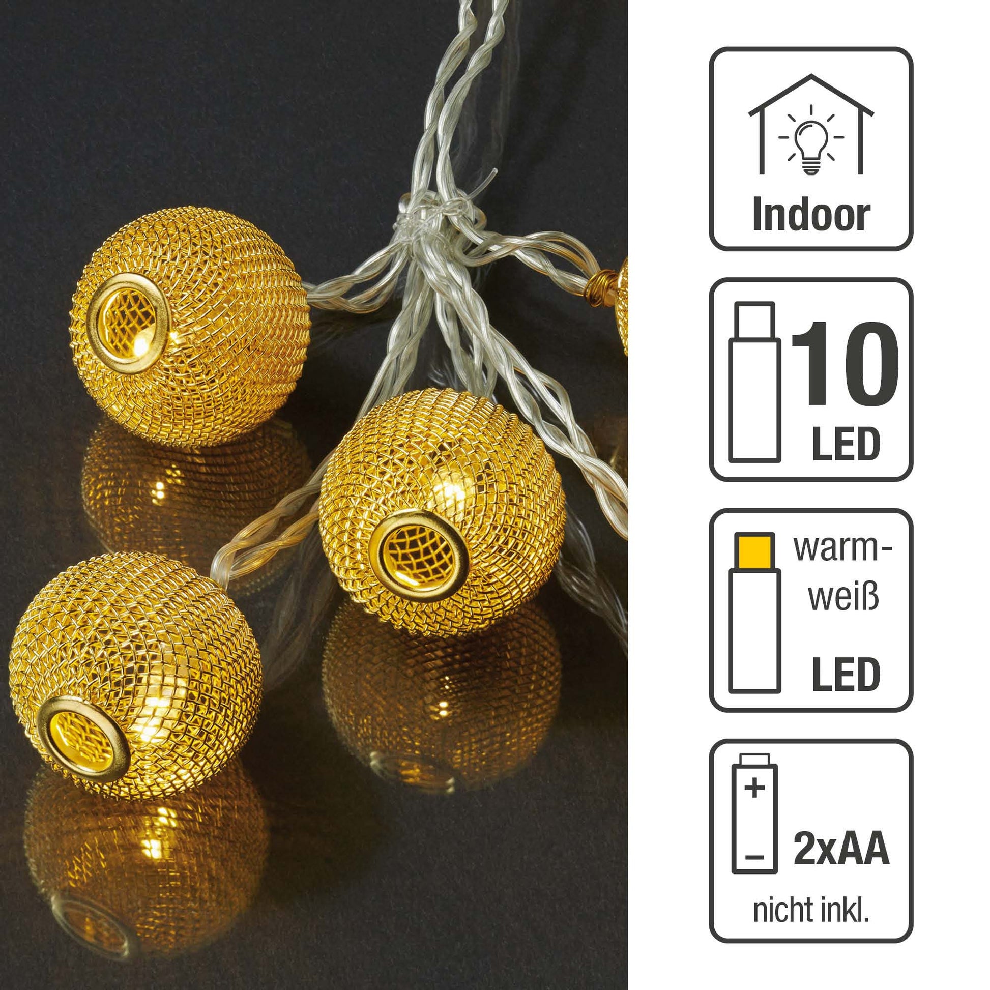 LED-Lichterkette mit goldenen Metallbällen, 10 LEDs ww, batteriebetrieben 300314