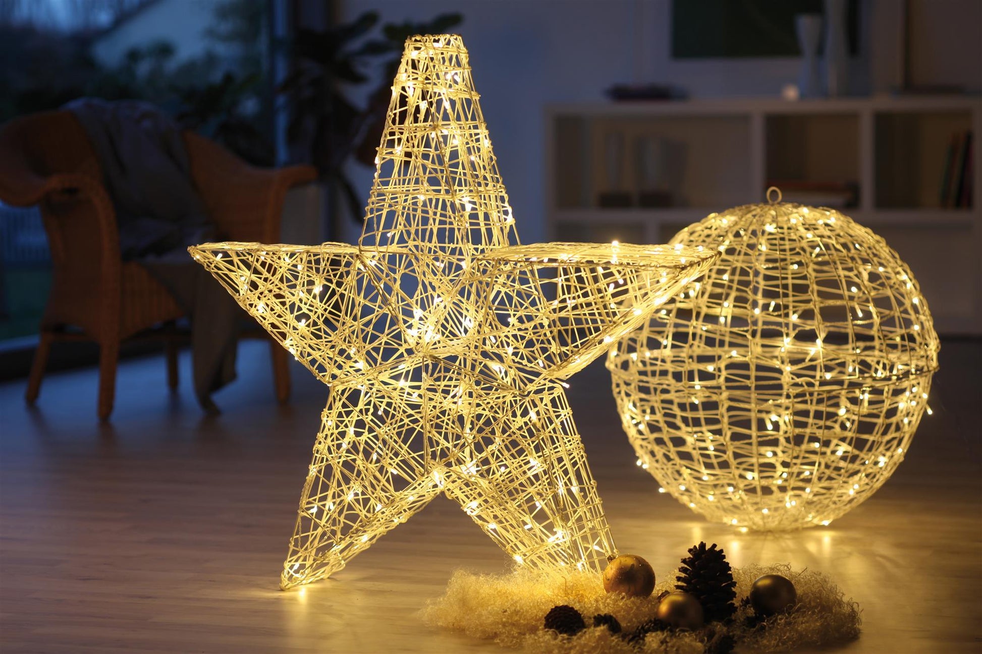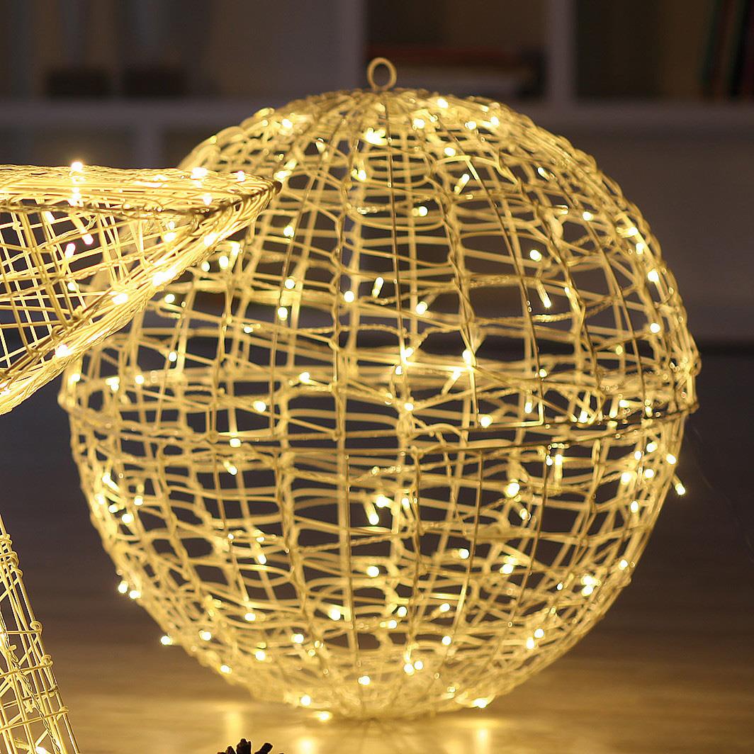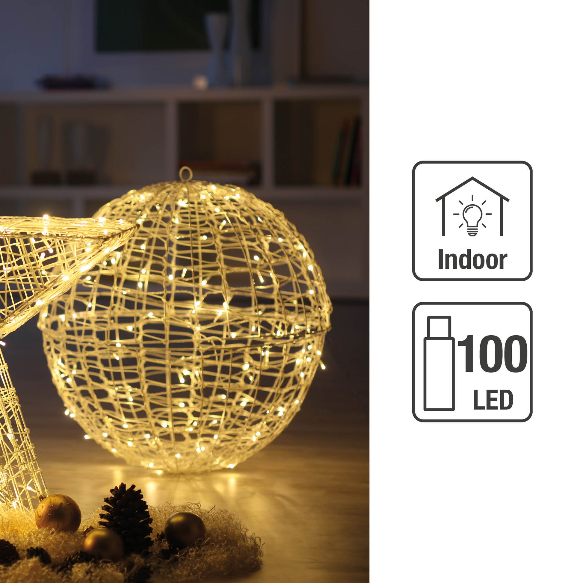 Diese LED-Kugel ist der Hingucker, nicht nur aufgrund ihrer imposanten Größe: Ein zeitlos-edles Drahtgeflecht vereint in sich moderne LED-Technologie. Die imposante Anzahl von 98 warmweißen LEDs lässt die Kugel als strahlenden Eye-Catcher erstrahlen. Und zudem ist man noch flexibel - die Kugel lässt sich in zwei Halbkugeln zerlegen. Der Phantasie sind praktisch keinerlei Grenzen gesetzt - lassen Sie Ihrer Inspiration freien Lauf!