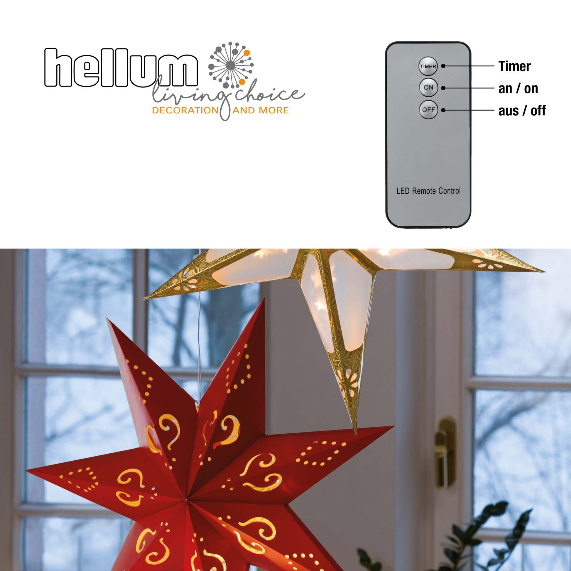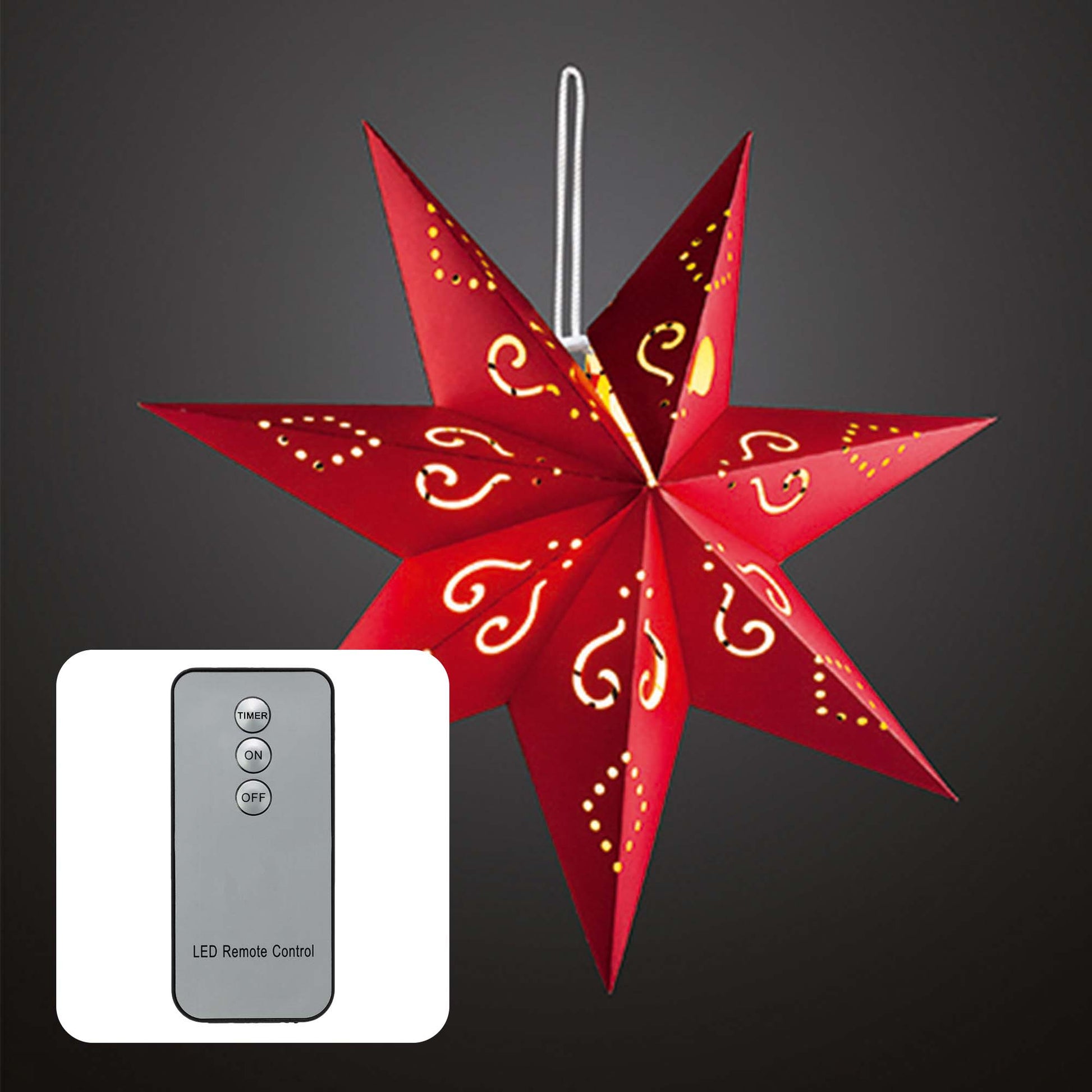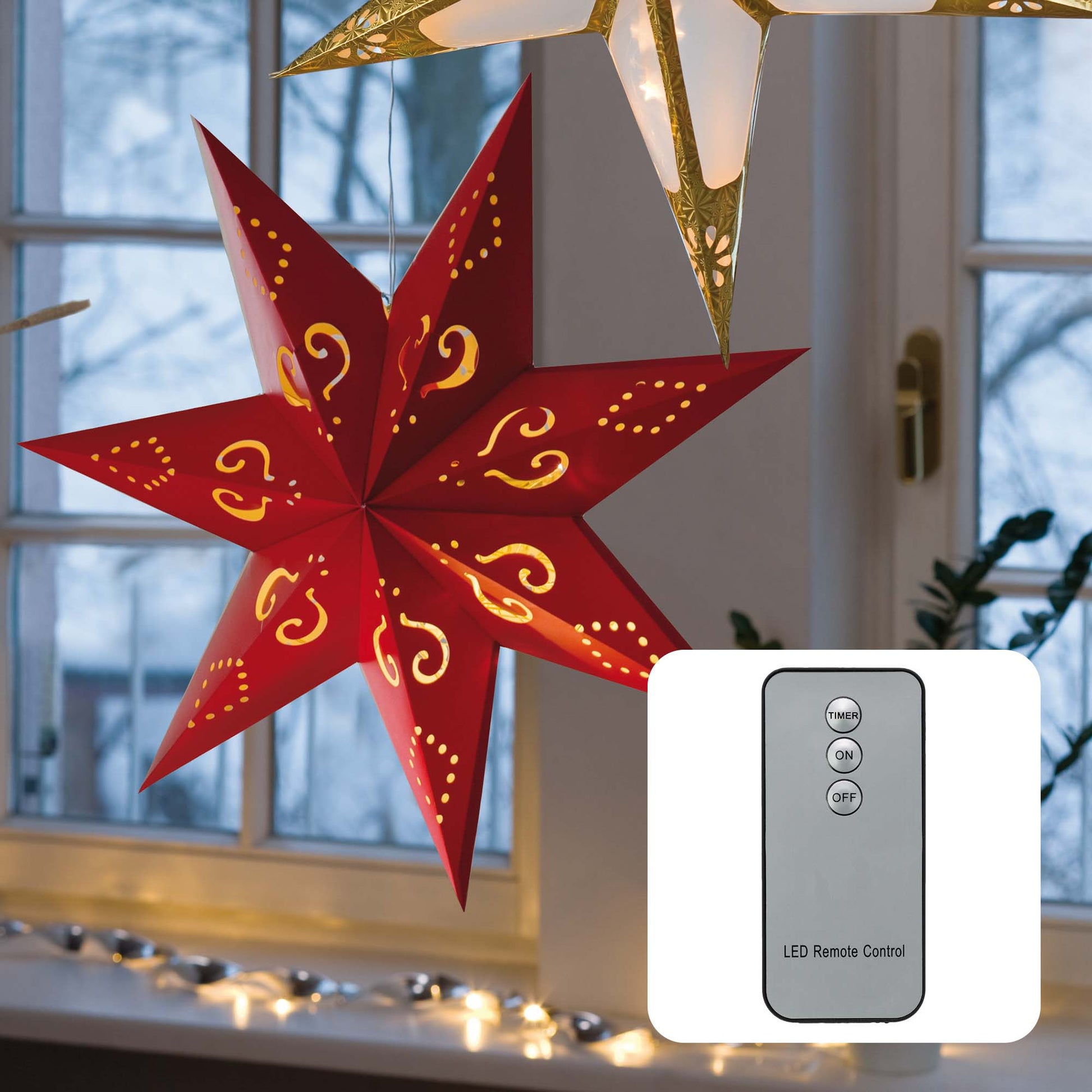 LED-Papierstern zum Aufhängen, rot, 30 LEDs ww, mit FB, batteriebetrieben