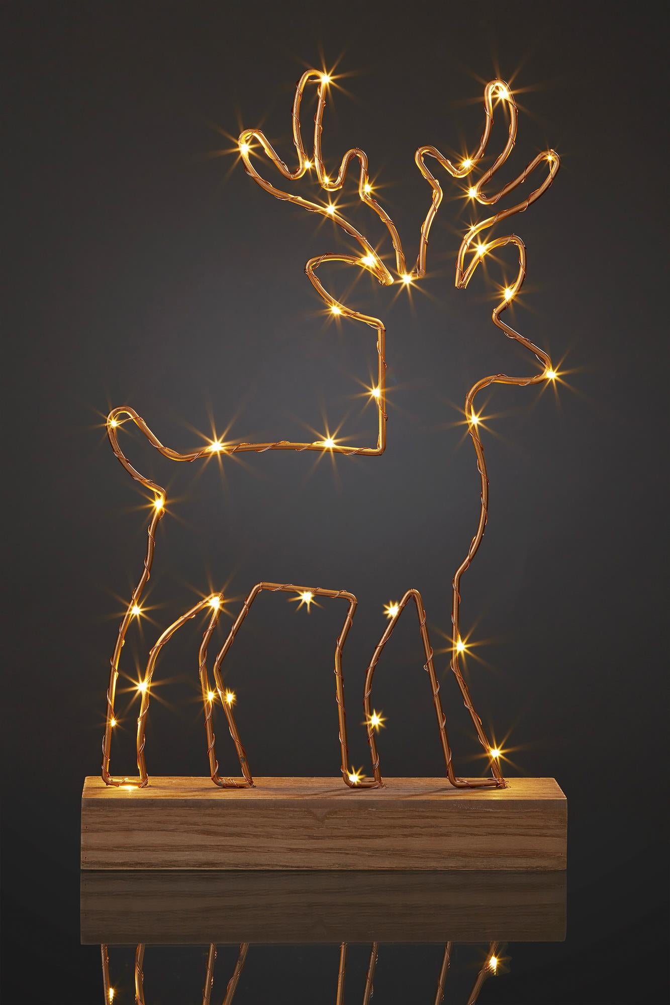 Das Rentier auf Holzpodest ist der Hingucker: Durch seine 40 warmweiße LEDs verströmt es ein angenehmes Licht und sorgt für weihnachtliche Stimmung. Das edle Holzpodest lässt es stabil stehen, und durch das integrierte Batteriefach ist es unabhängig von einer Stromquelle, sodass es sich quasi überall hin platzieren lässt. Zudem ist ein 6-Std.-Timer mit verbaut, der das Rentier auf Wunsch automatisch ausgehen lässt. Genießen Sie viele schöne Weihnachtsstunden mit diesem Rentier!