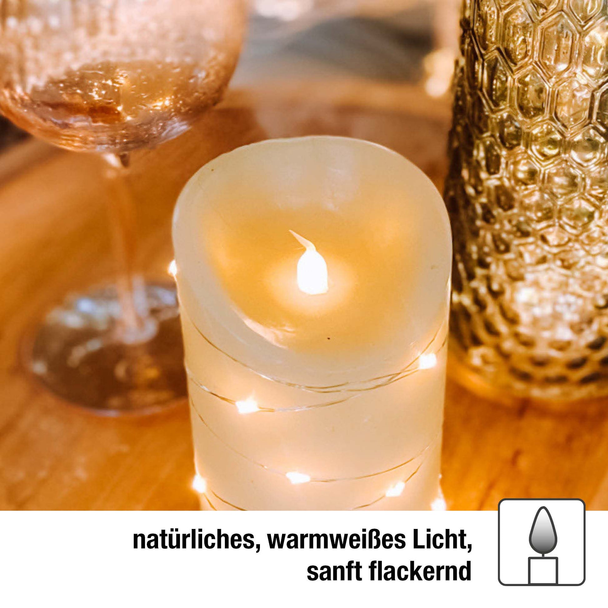 LED-Wachskerze mit Lichterkette "Tautropfen" , H 15cm, D 10cm, 29 + 1 LEDs ww, batteriebetrieben