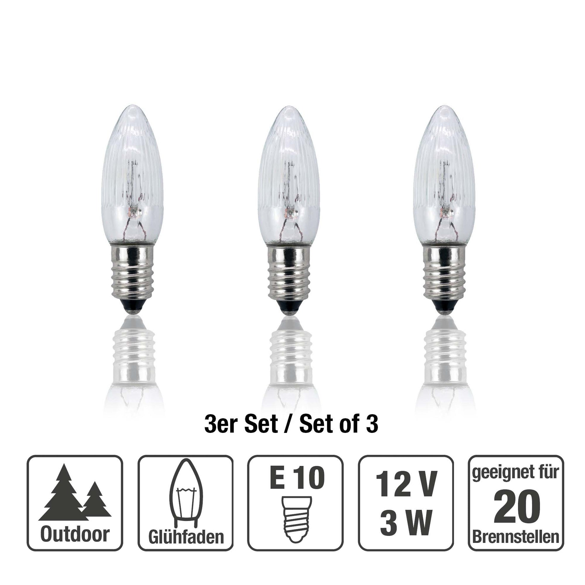Ersatzkerzen Lichterkette 12V 3W für Lichterketten & Schwibbogen, 3 Stk Riffelkerzen E10 für 20 Brennstellen innen & außen 920024